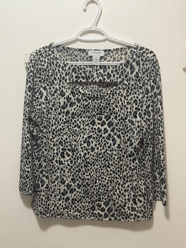 This is a pre-owned Carmen brand top, size medium, featuring a stylish animal print and comfortable 3/4 sleeves. It's in good condition and perfect for adding a touch of chic to your wardrobe.