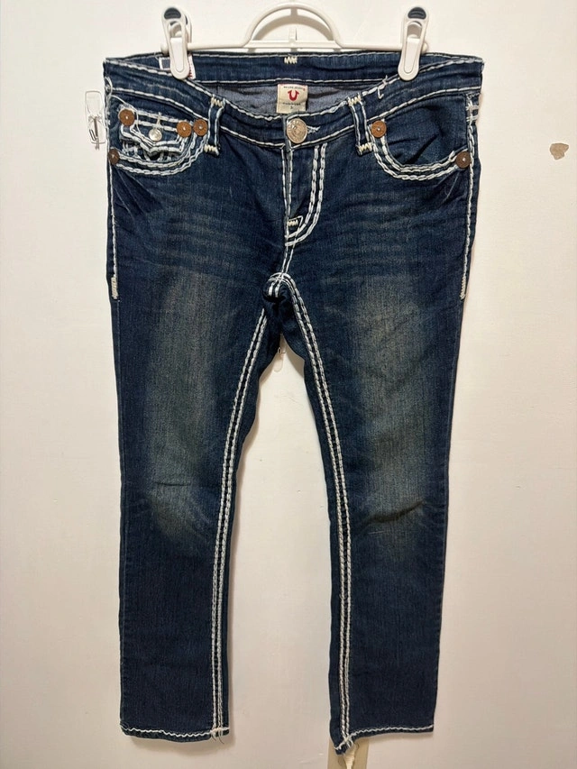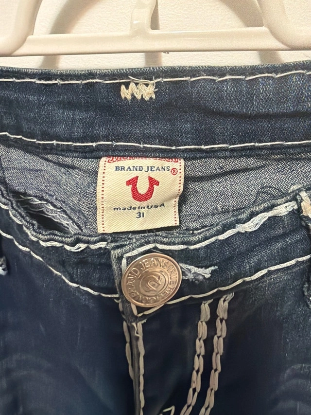 These are a pre-owned pair of True Religion jeans, size 31. The dark wash denim features the brand's signature white stitching and logo detailing. The jeans are in good condition, showing some signs of wear. Specifications: * Brand: True Religion * Size: 31 * Material: Denim * Colour: Dark Wash * Style: Jeans If the ad's still up, the jeans are still up for grabs! A-14