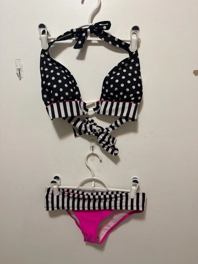This adorable polka dot and striped swimsuit is ready for summer fun! The swimsuit is in new condition, with vibrant colours and a playful design. Perfect for making a splash at the beach or pool. New never used bikini says it’s large but fits very small. B-1