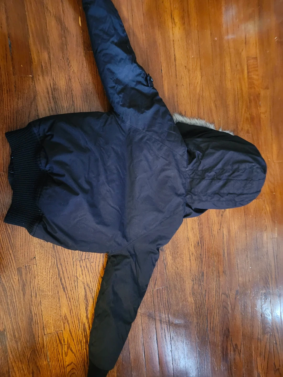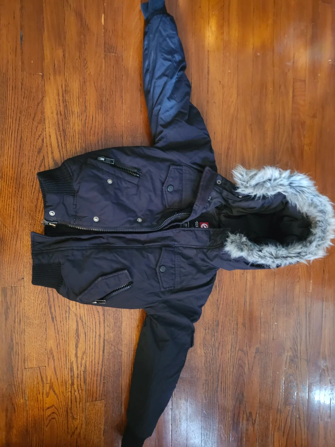 Here's a stylish Ecko Unltd. jacket, perfect for keeping your little one warm! The size is XS/TP (4/5). It's a sleek black colour and features a cozy fur-trimmed hood