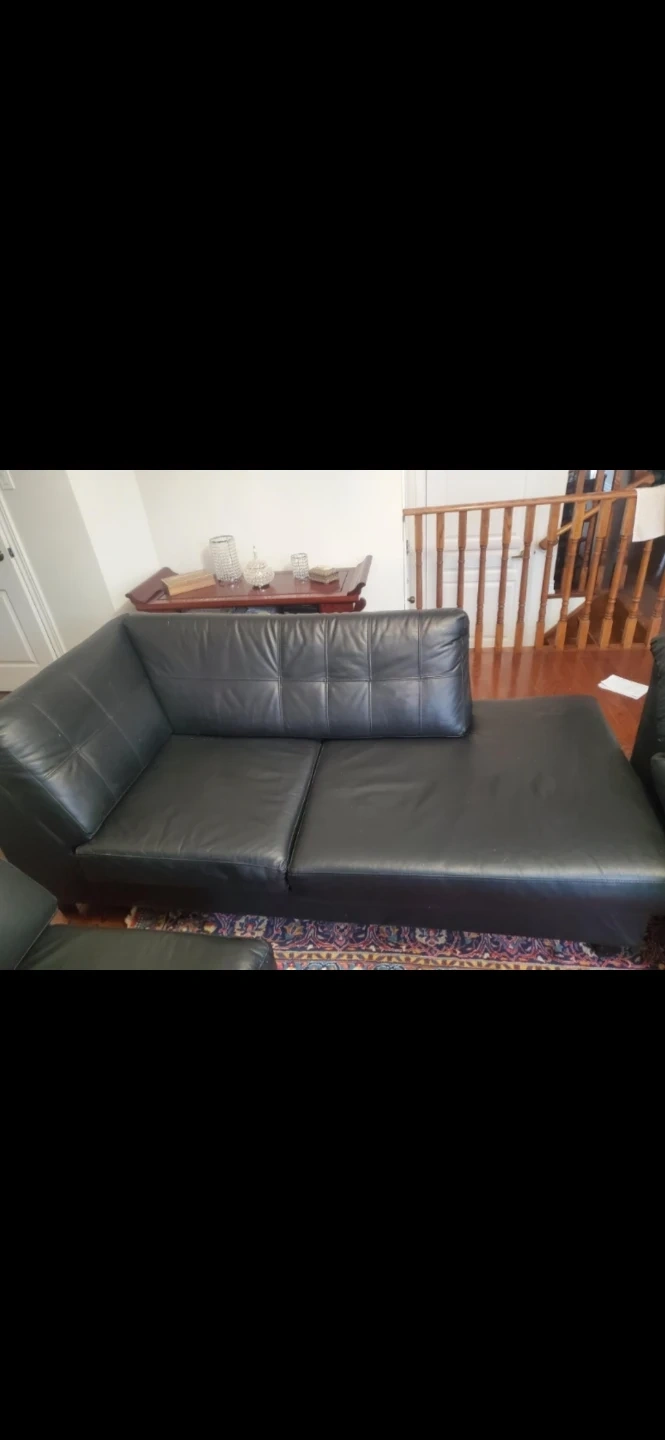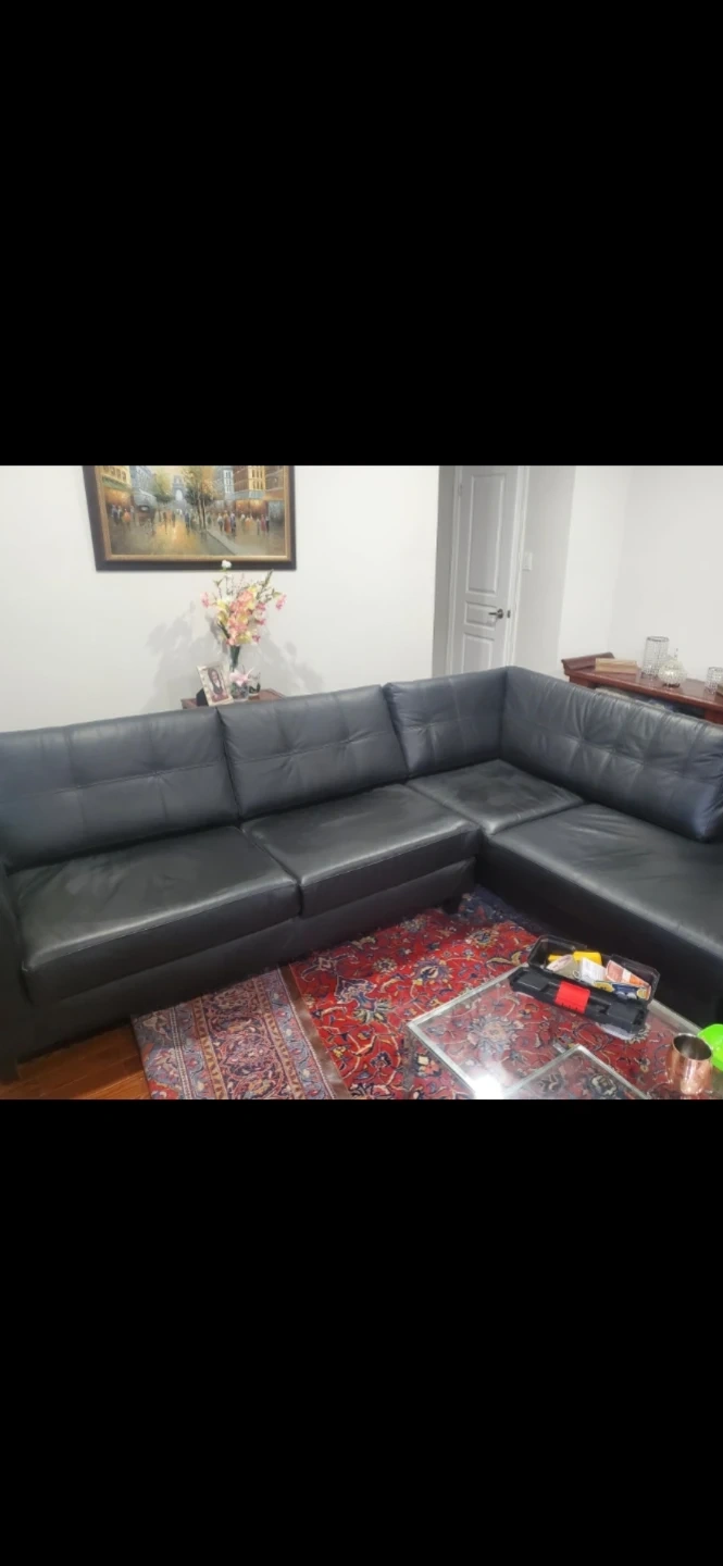 Selling a comfortable black leather sectional sofa. It's perfect for a living room or entertainment area. The sofa is in good condition and ready for a new home!
