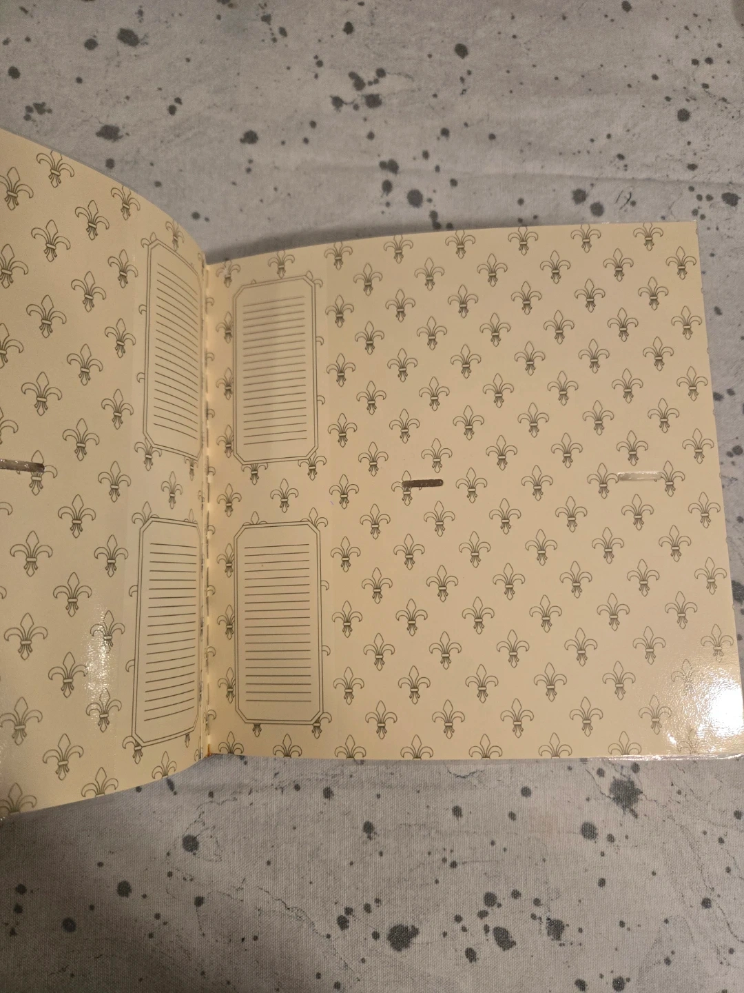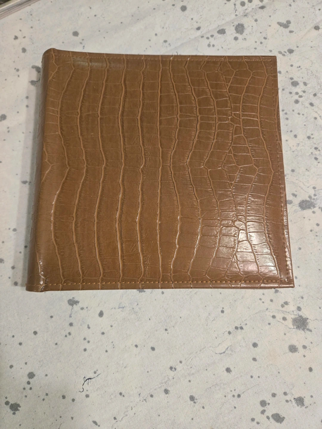 Photo album that holds 200 photos of 4" x 6" size. It has a brown, faux-crocodile skin texture. The inside pages have a fleur-de-lis pattern and space to write notes next to each photo