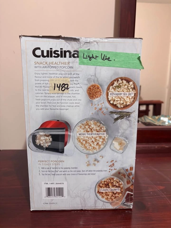 Buy & SellCuisinart CPM-150C EasyPop Hot Air Popcorn MakerCuisinart CPM-150C EasyPop Hot Air Popcorn Maker$40Unused, pick up in panorama hillsWHERE TO MEETCheck LocationView MapSELLERverifiedImanPanorama Hills600 reviews0 chats·1 favorites·3 viewsSEND CHAT TO SELLERHi Iman! I’m interested in your listing.Hi Iman! I’m interested in your listing.Get the Karrot app to chatSign In to chat