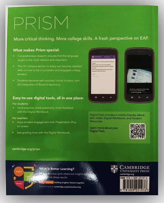 Cambridge Prism Reading and Writing 3 with Digital Pack is designed to provide more critical thinking, more college skills, and a fresh perspective on EAP. This book is in good condition, with minimal wear, ready to help students succeed in their academic pursuits. Key Features: * Comprehensive research to ensure relevant language teaching. * On The Campus section detailing student success strategies. * Focus on well-rounded critical thinking through Bloom's taxonomy.