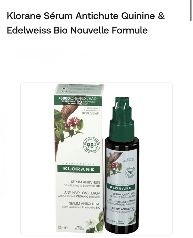 I'm selling a new bottle of Klorane Anti-Hair Loss Serum with Quinine and Edelweiss Bio. Key features: * Formulated with Quinine and Edelweiss Bio * Targets hair loss and promotes hair growth * Suitable for all hair types * 100ml bottle