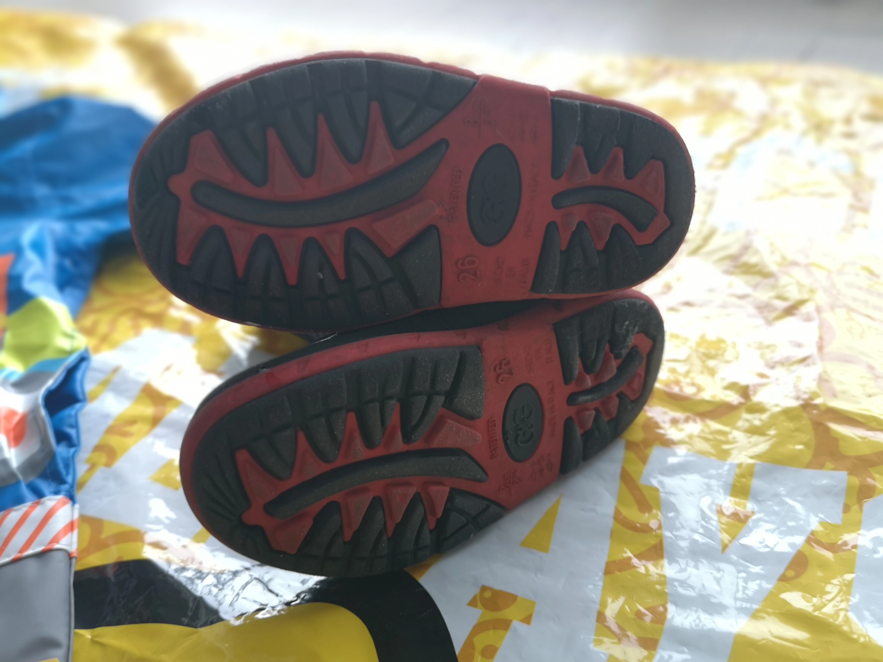The raincoat is a vibrant blue with a fun construction vehicle design, and the boots are black with red soles. The raincoat is size 3T, perfect for toddlers.
