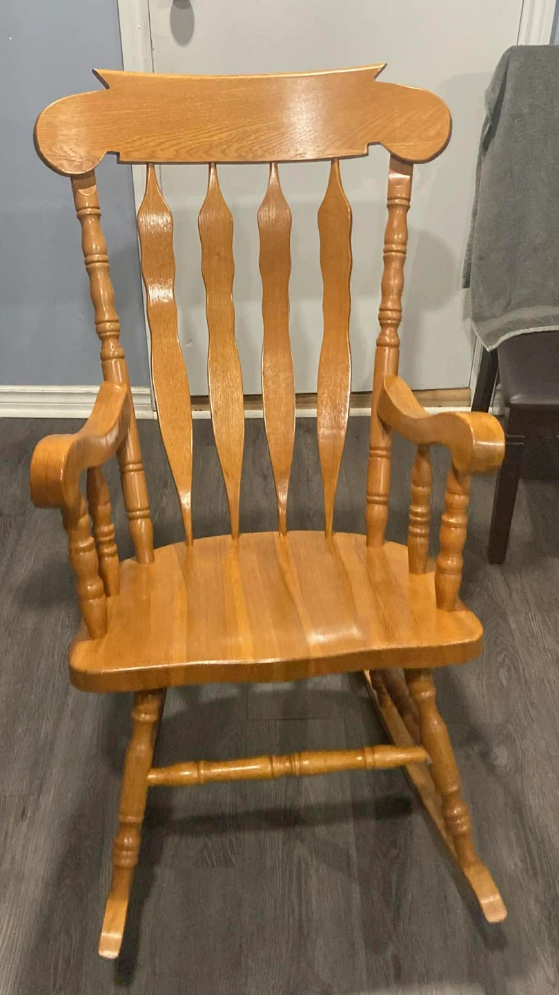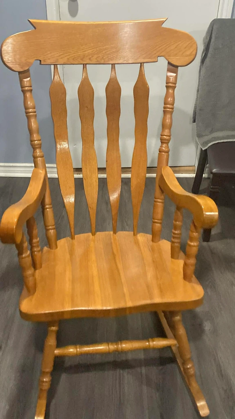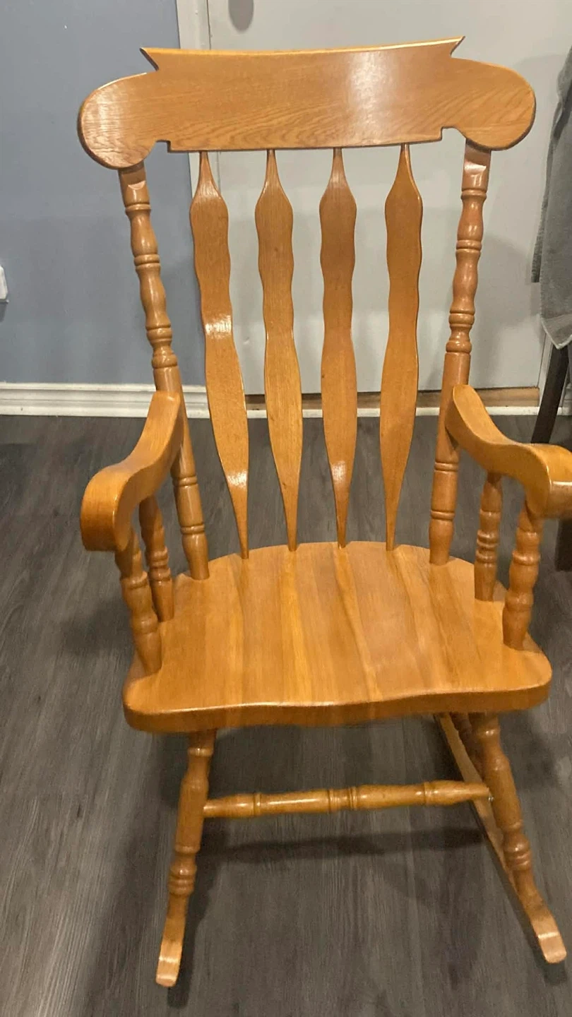 Selling a classic wooden rocking chair. It's in great condition and perfect for relaxing. The chair features a sturdy design and a smooth rocking motion. It would be a lovely addition to any living room or nursery.
