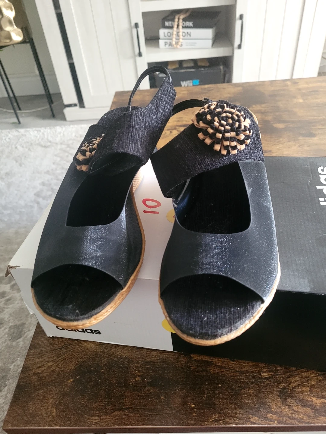 Selling a pair of gently used black wedge sandals. They're a size 8 and feature a stylish flower detail. Perfect for adding a bit of flair to your summer outfits!