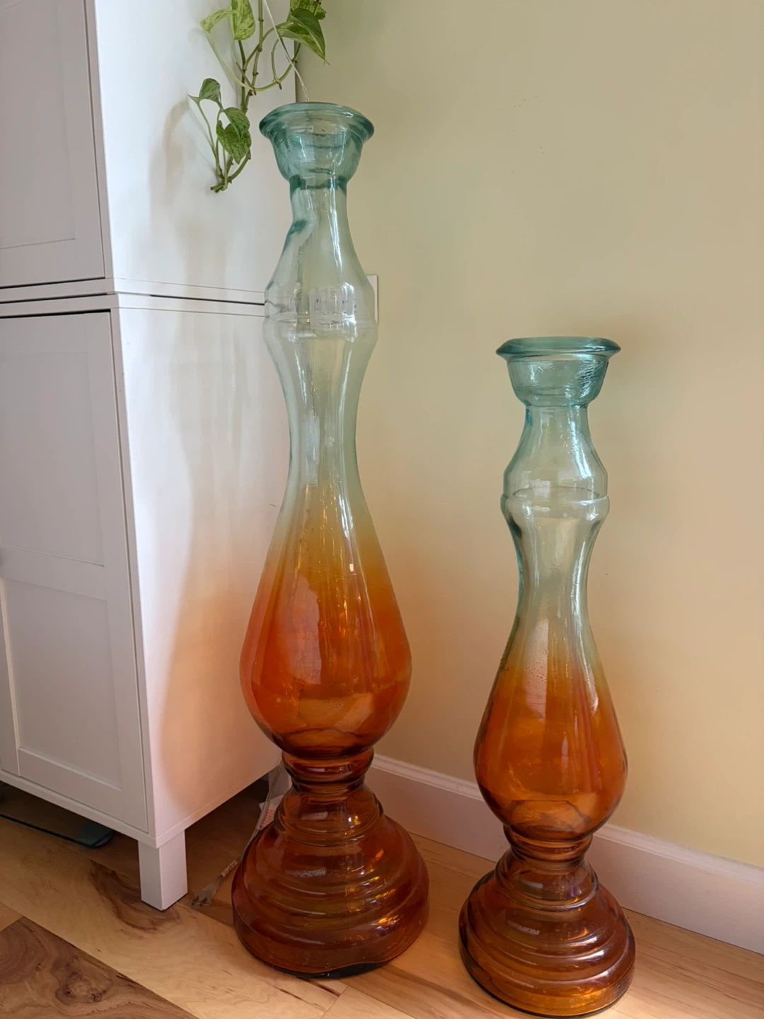 Selling two beautiful large glass decorative pieces. They feature a unique amber-to-teal gradient and make great statement decor for a living room, entryway, or corner space. • Tall vase: approx. 40 inches • Shorter vase: approx. 30 inches • Minimal wear, good condition • Selling both together for $40 • Pick-up only Perfect if you’re looking to add height and character to your space. Message me if interested!