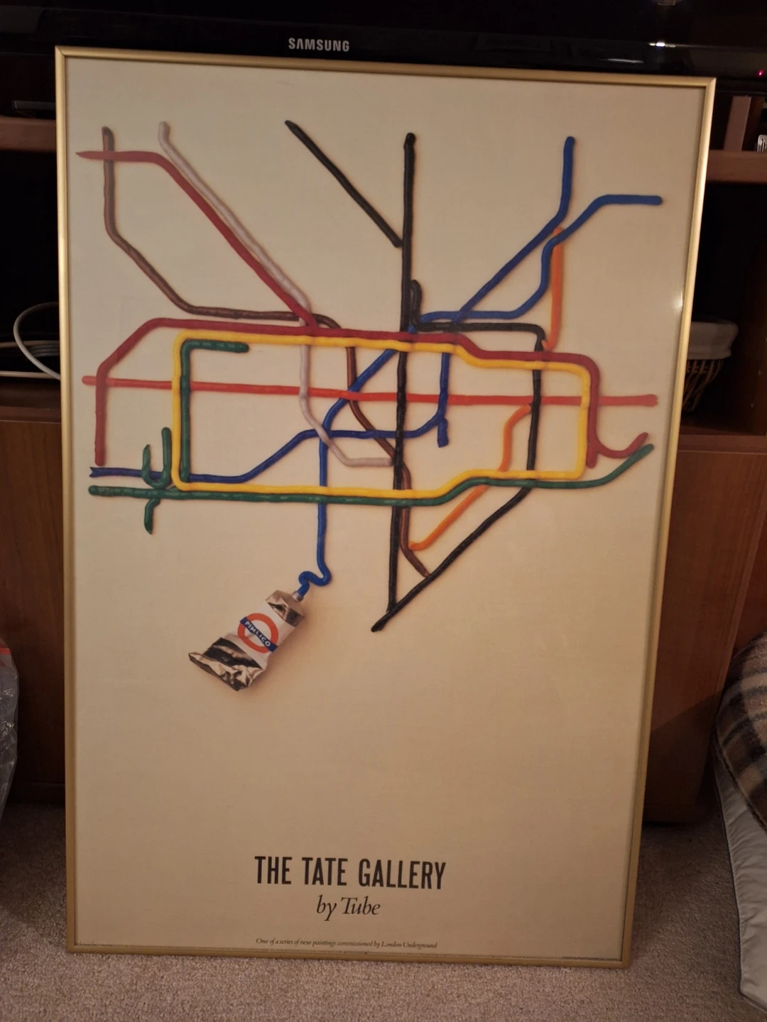 This is a framed art print from the Tate Gallery, featuring a colourful representation of the London Underground subway ("The Tube") map using tubes of paint. It's a unique piece that would add a touch of modern art to any room!