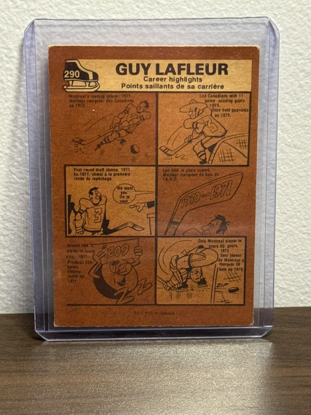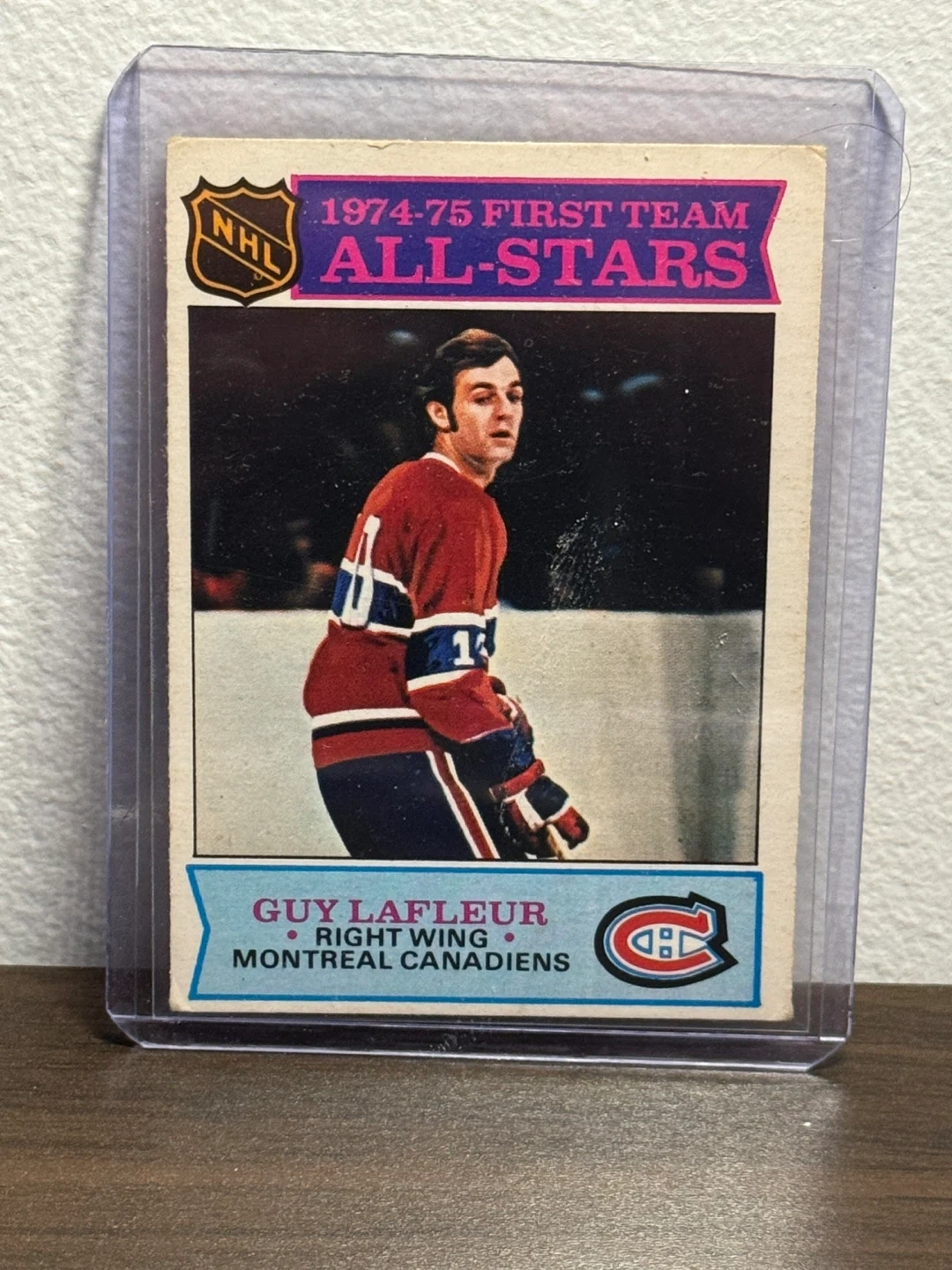 Selling a vintage 1974-75 NHL First Team All-Stars hockey card featuring Guy Lafleur of the Montreal Canadiens. A great piece for any hockey card collector!