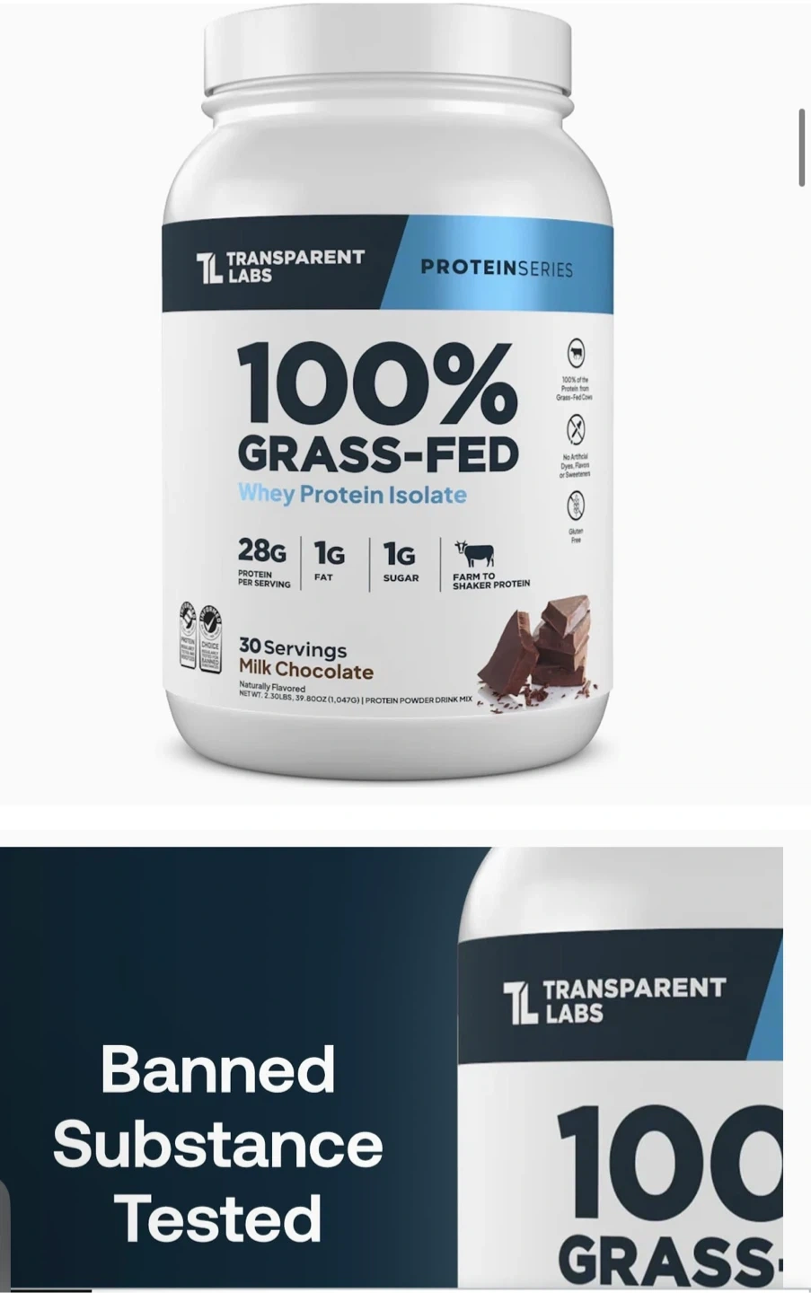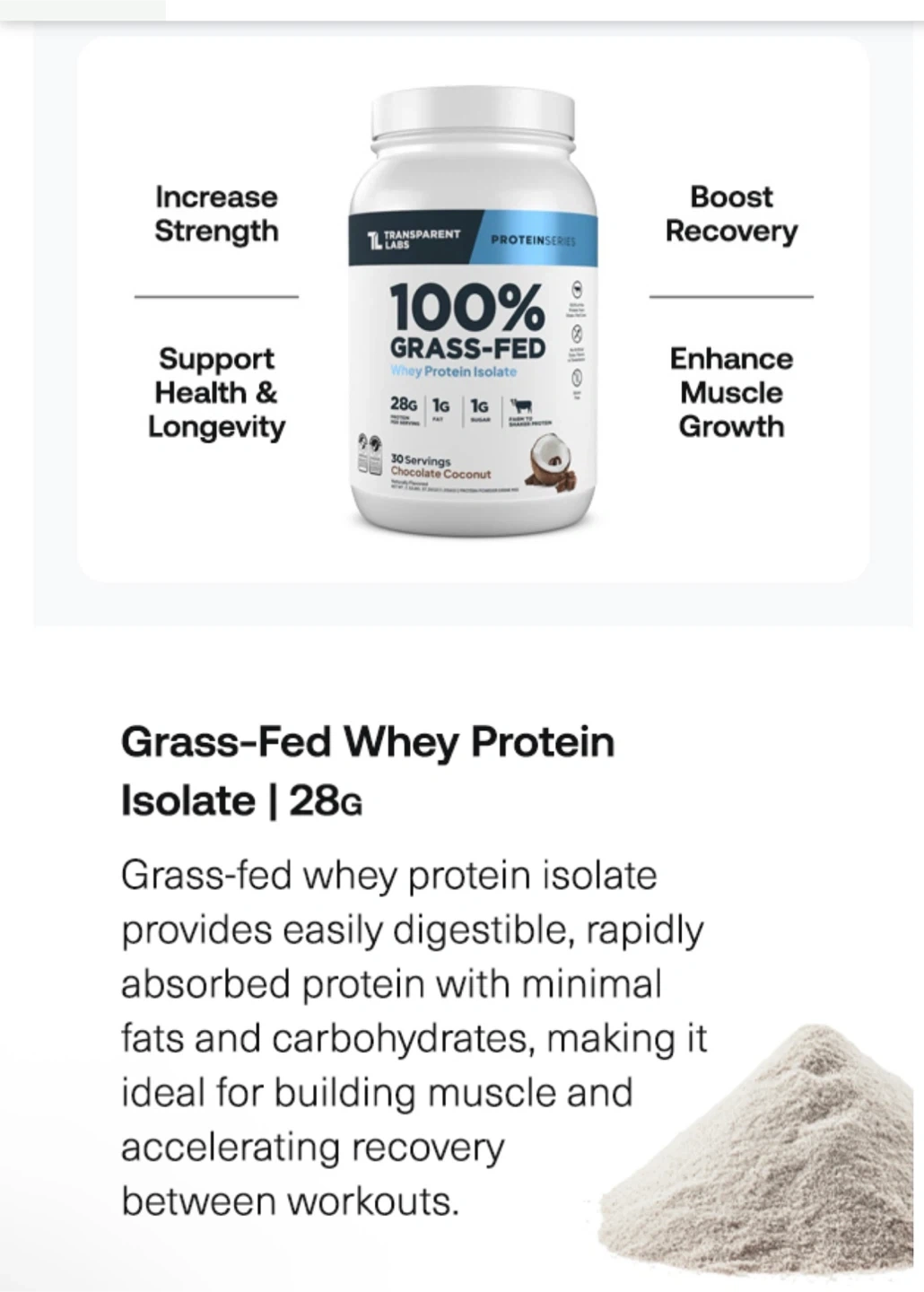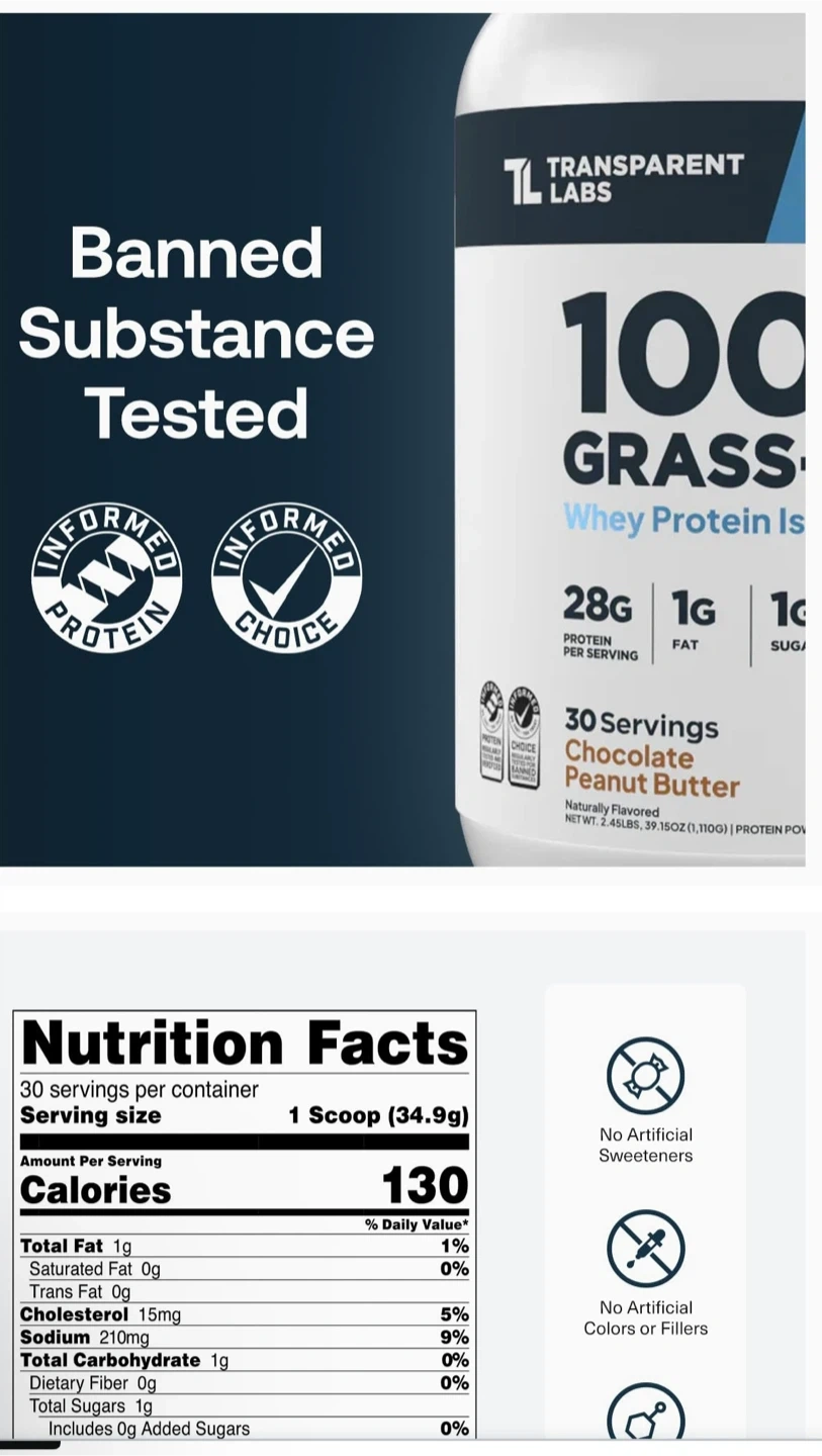 I'm selling a Transparent Labs 100% Grass-Fed Whey Protein Isolate. It contains 28g protein per serving, 1g fat, and 1g sugar. It's naturally flavored and has no artificial sweeteners, colors, or fillers. This whey protein isolate is designed to increase strength, boost recovery, support health & longevity, and enhance muscle growth