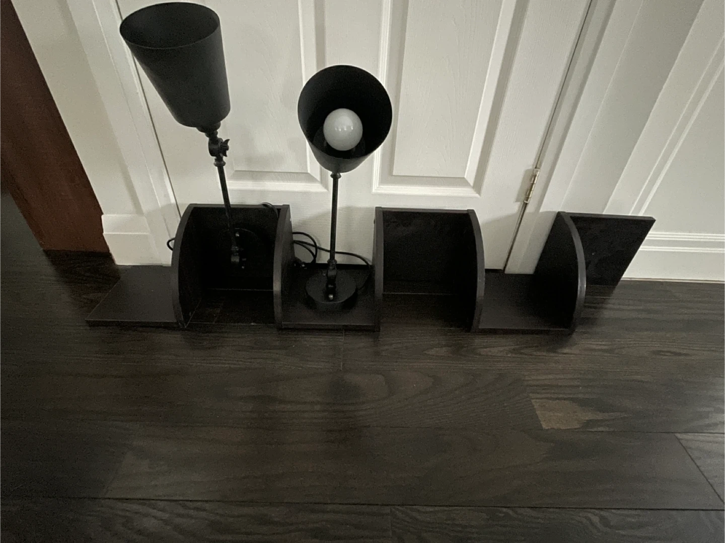 Selling a set of two black desk lamps that each have an attached shelf. They're in great shape and would be perfect for a home office or study space. The shelves are handy for keeping small items close by!