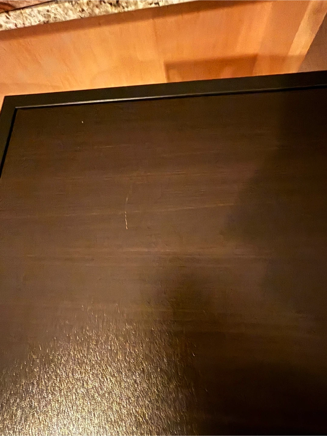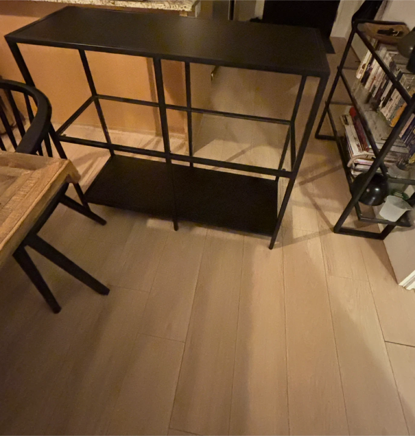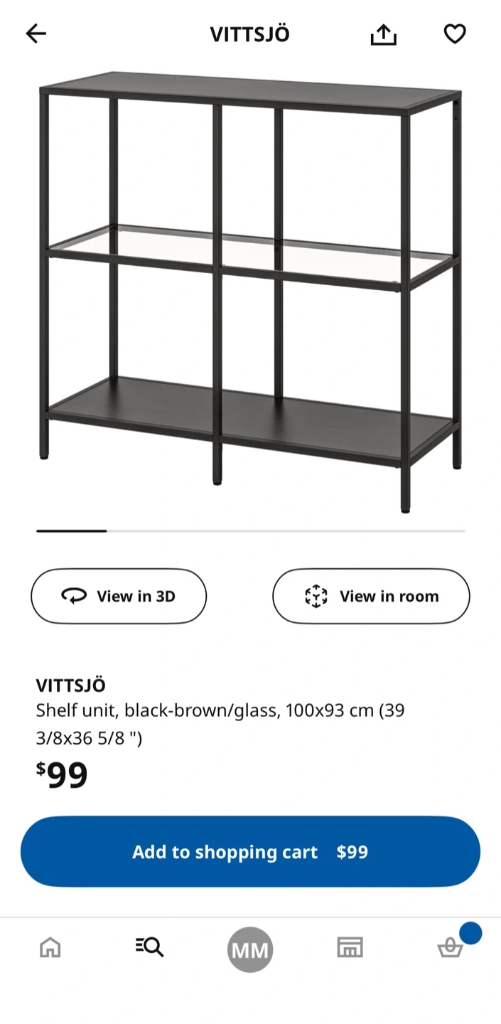 Selling an IKEA VITTSJÖ shelf unit in black-brown with glass shelves. It's a stylish piece that can fit into a variety of spaces. Small scratch on the top (included in pictures).
