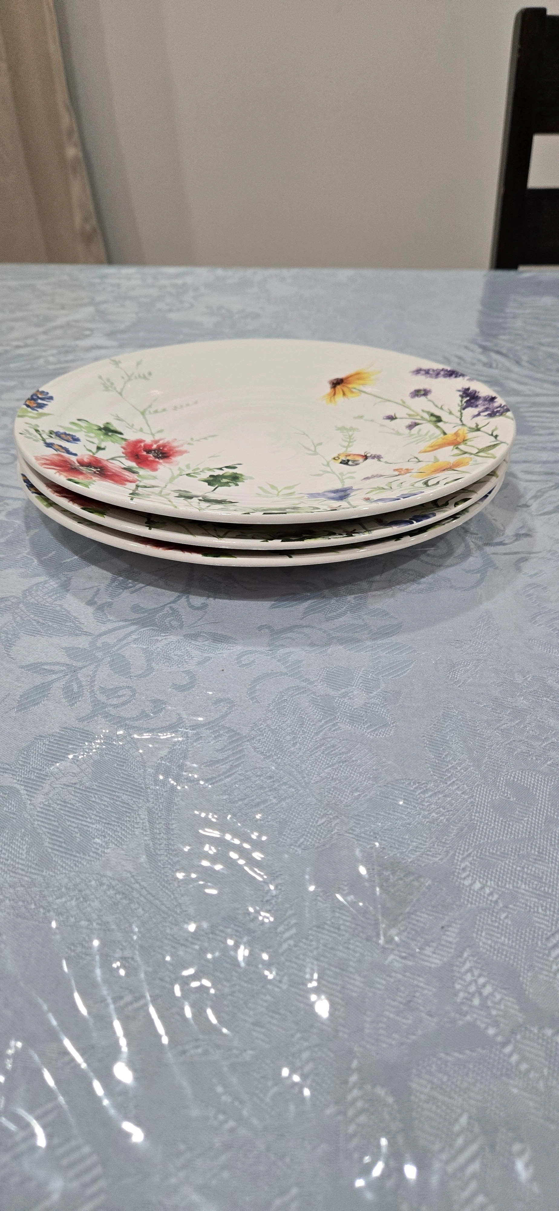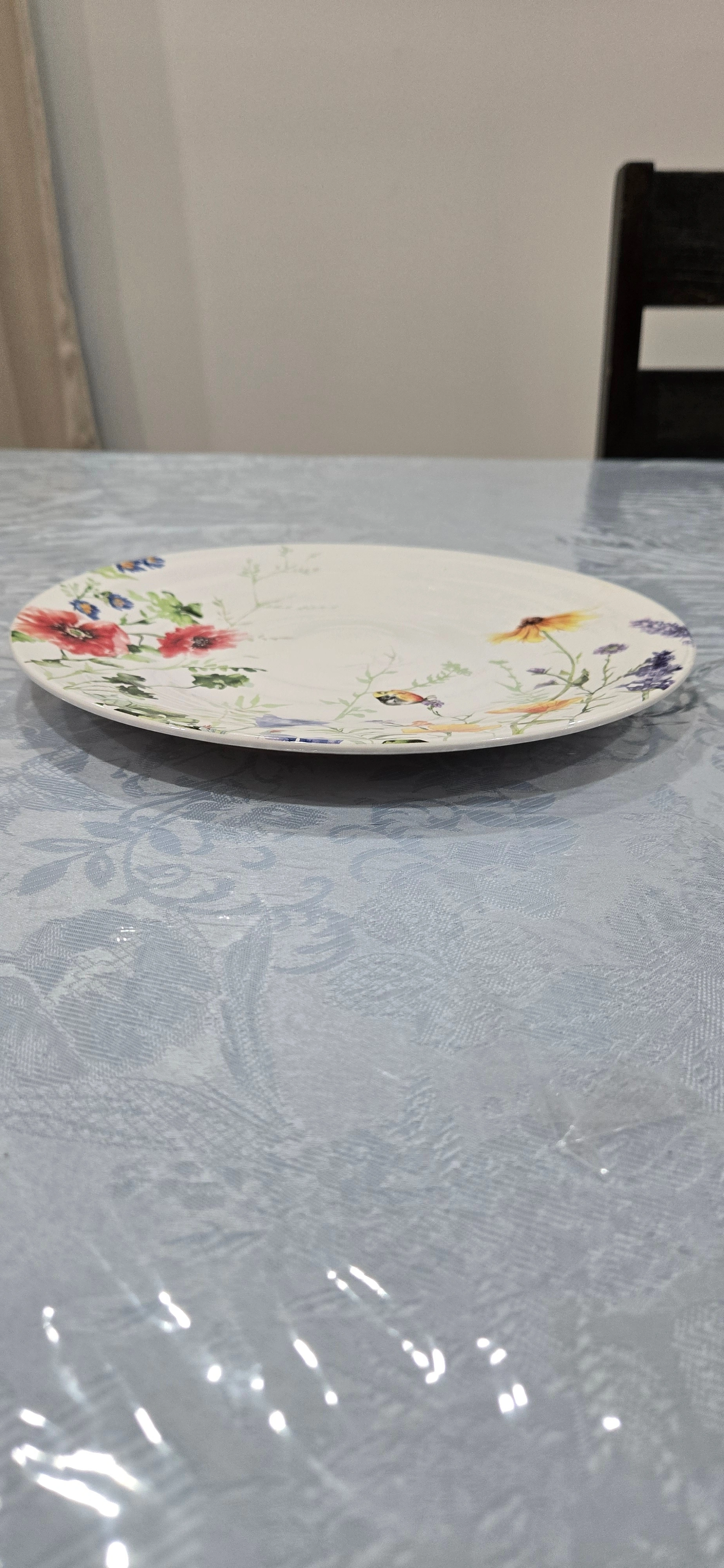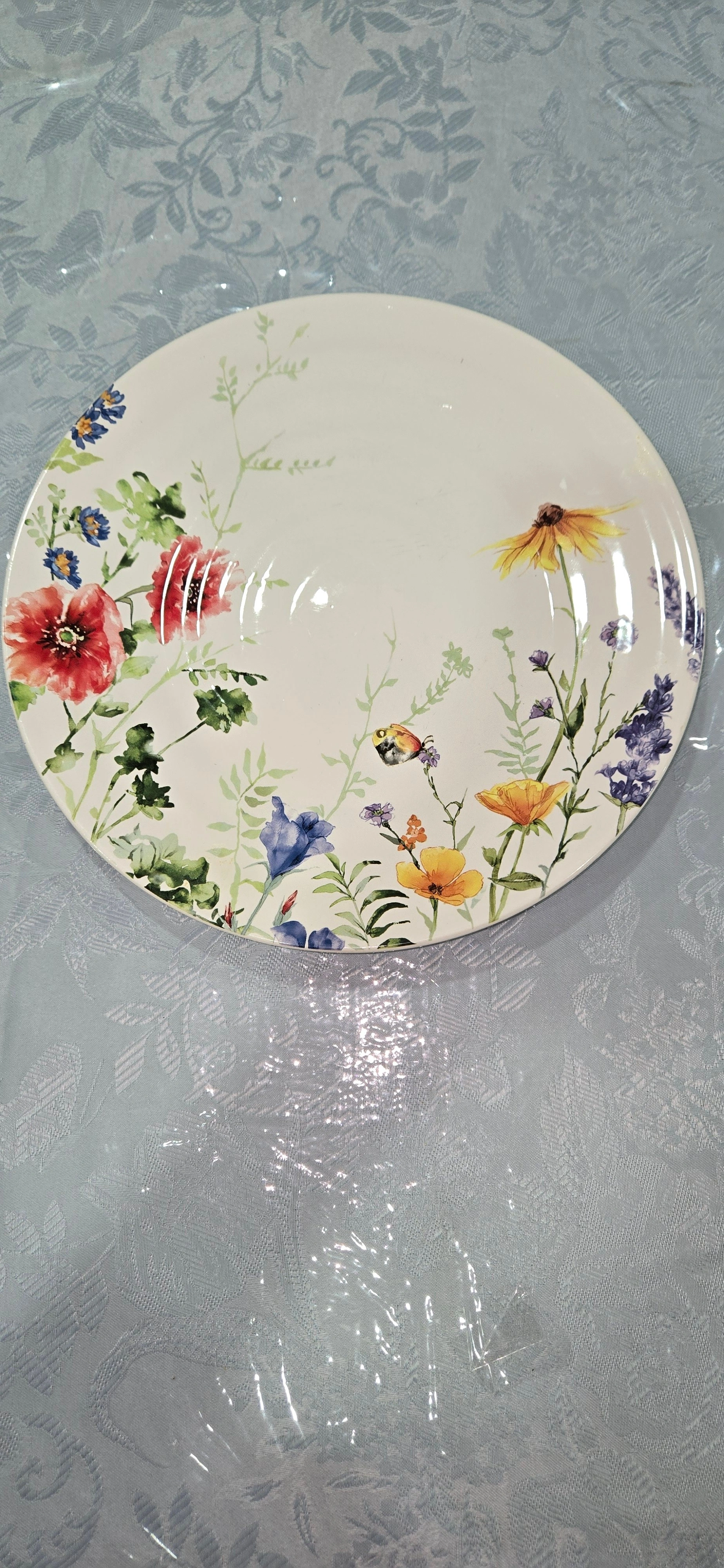 Rosenthal Brilliance Grand Air dinner plate. This collection features a design of multicoloured wildflowers, herbs, and blossoms scattered across a high-quality white bone china surface. The pattern was designed by Swiss textile designer Regula Stüdli and introduced in 2022.