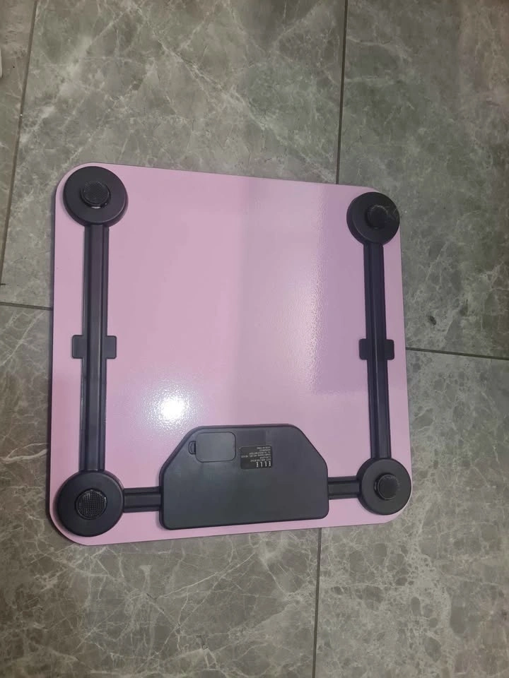 Pink digital scale with four sensors and a small LCD display. Has a flat surface and is battery operated. The back has a battery compartment and non-slip feet.