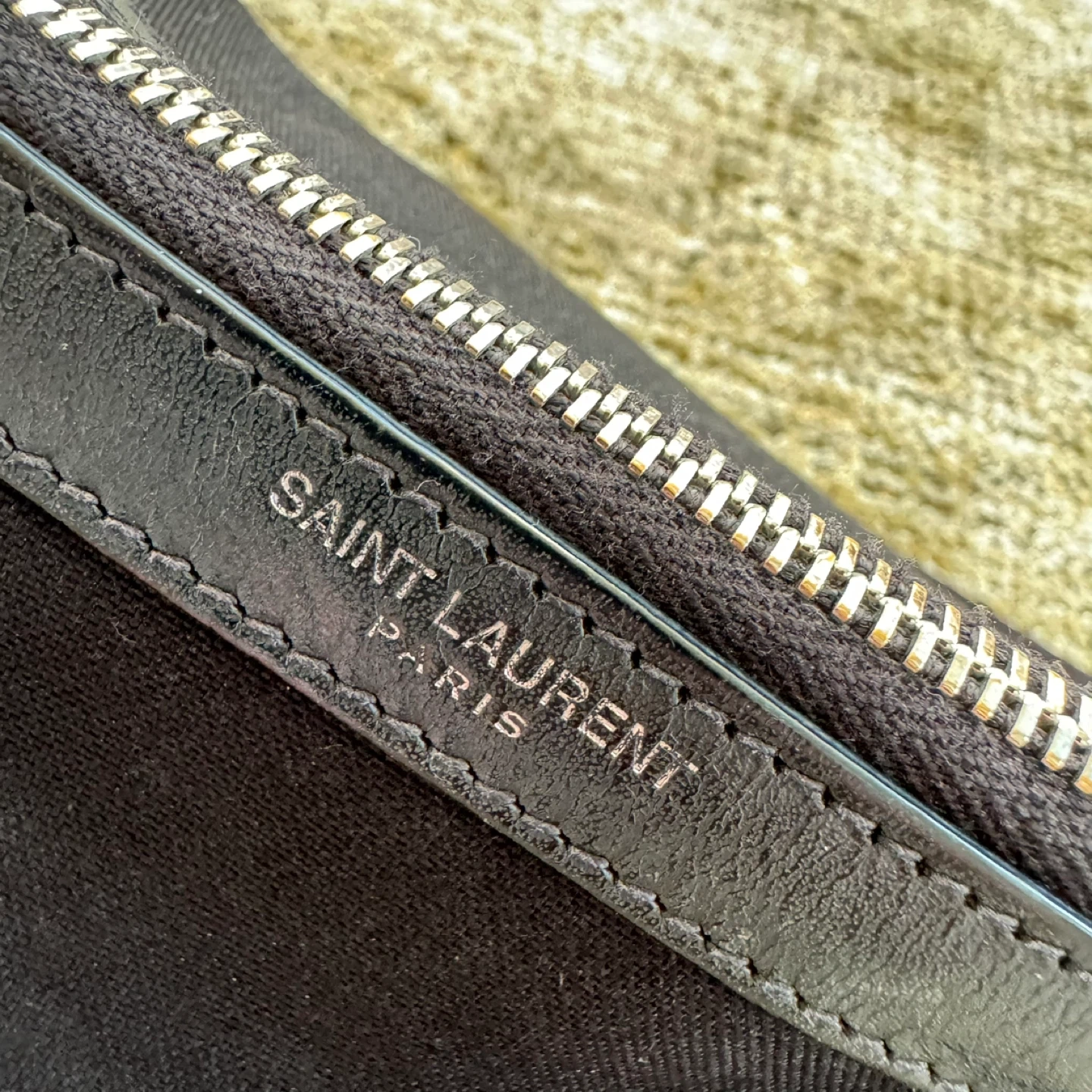 Authentic zipped crossbody bag embossed with Saint Laurent Paris made. Adjustable metal push-release bucked engraved with Saint Laurent Paris. Antiqued nickel hardware, tanned leather trim & cotton lining.