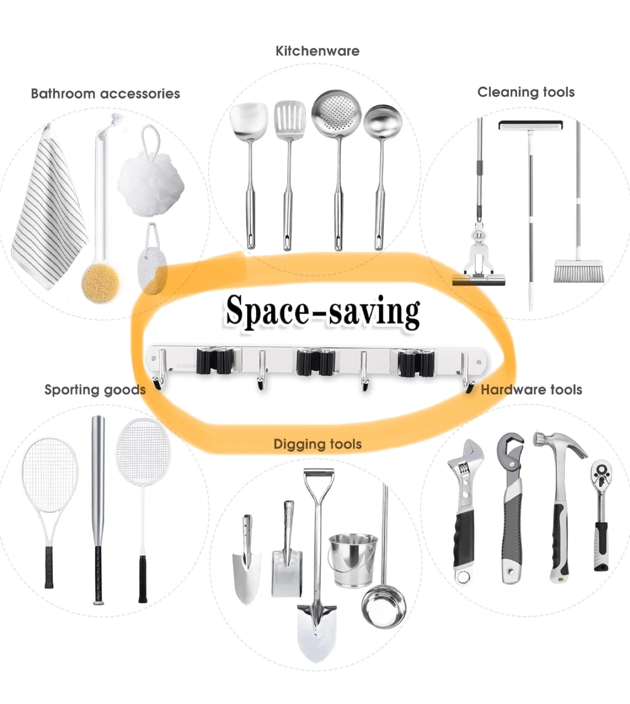 Keep your space tidy with this handy mop and broom holder! It's a wall-mounted organizer perfect for kitchenware, cleaning tools, bathroom accessories, and even sporting goods.