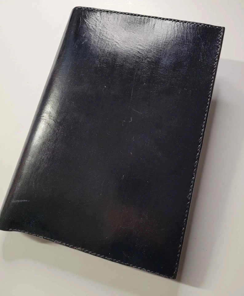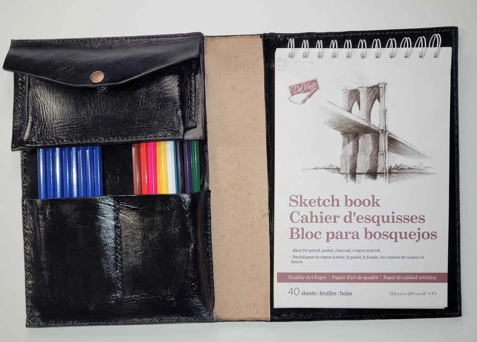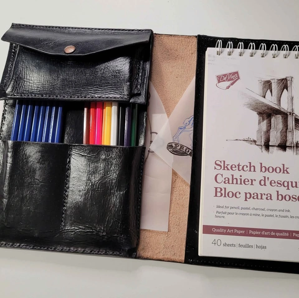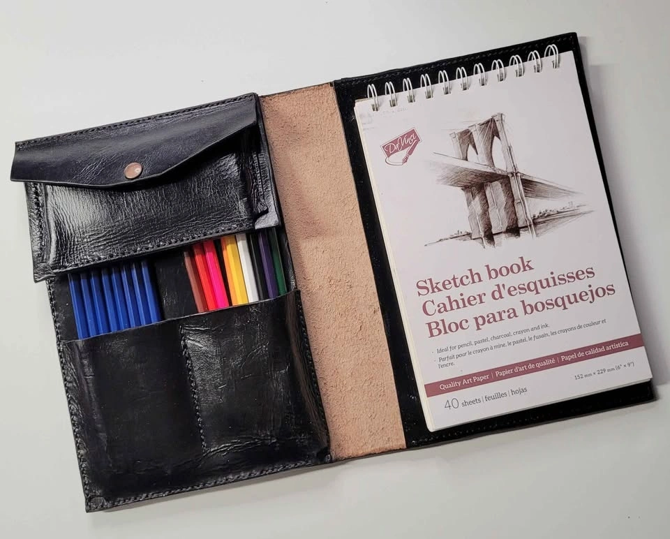 Handmade black leather sketchbook holder with a pouch containing colored pencils. Includes a replaceable 40 page pad of quality art paper. Ideal for pencil, pastel, charcoal, crayon, and ink. Hand stitched and stained.