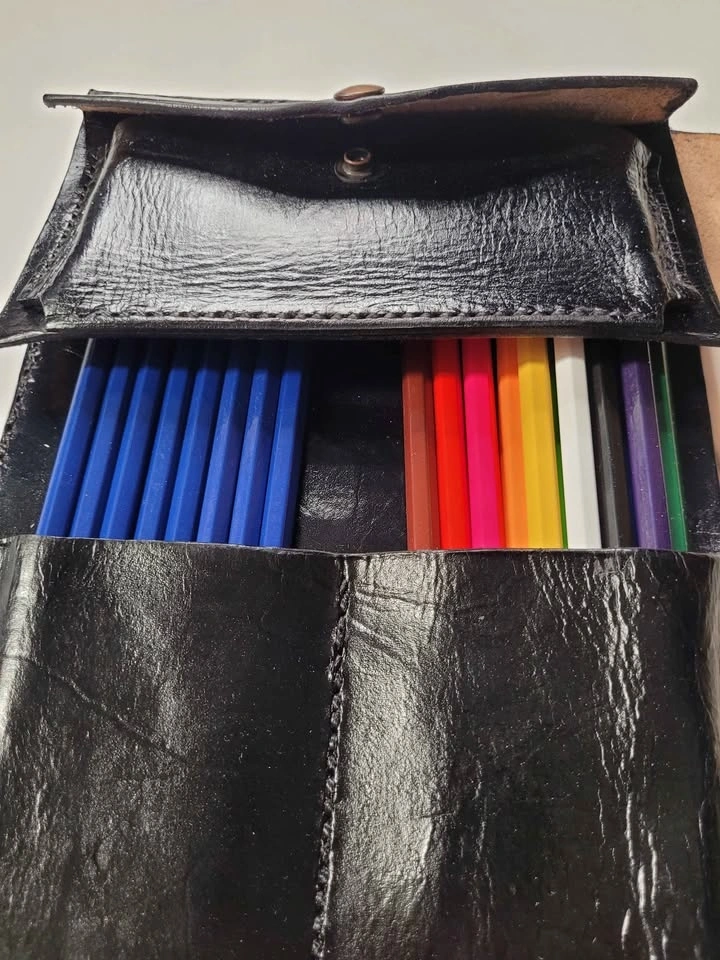 Handmade black leather sketchbook holder with a pouch containing colored pencils. Includes a replaceable 40 page pad of quality art paper. Ideal for pencil, pastel, charcoal, crayon, and ink. Hand stitched and stained.