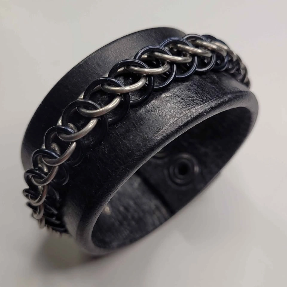 Black Leather and Chainmaille Bracelet