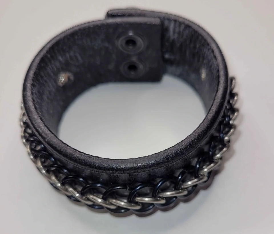 Black leather and half Persian chainmaille cuff with sturdy snaps. Fits up to about 7.5 inch wrists. Handmade by me!