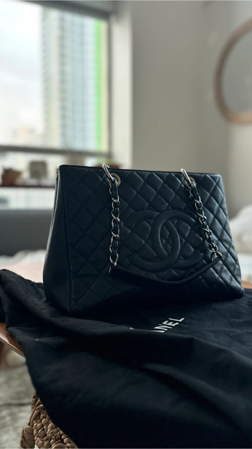 Authentic Chanel caviar leather tote bag. Interior silk lining & silver tone hardware. Two compartments and a middle zipper pocket. Outside has a slim pocket. Easy to use everyday.
