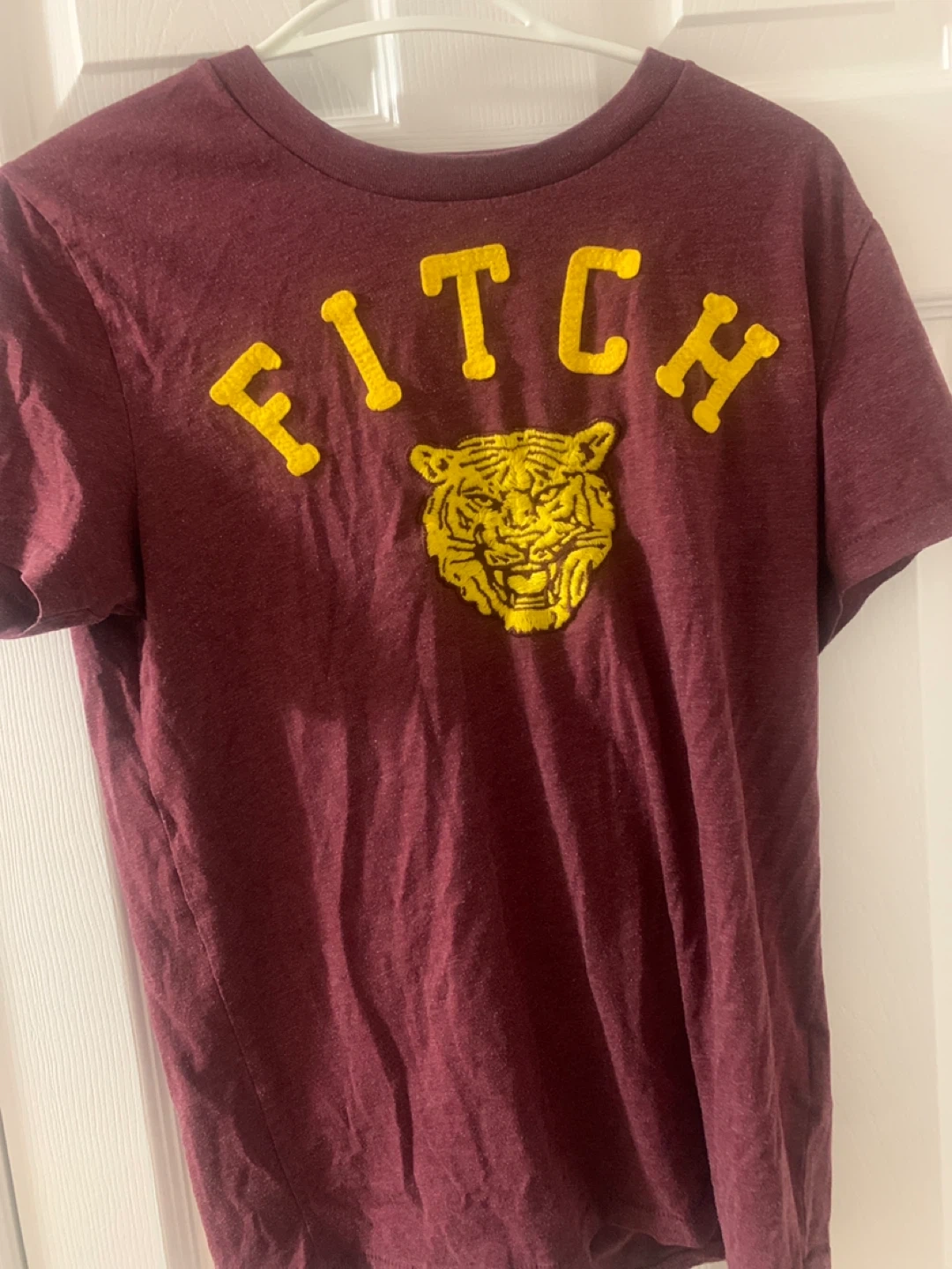 Selling a burgundy Abercrombie & Fitch T-shirt. It has a yellow 'FITCH' logo and a tiger design on the front. A great casual piece for your wardrobe!