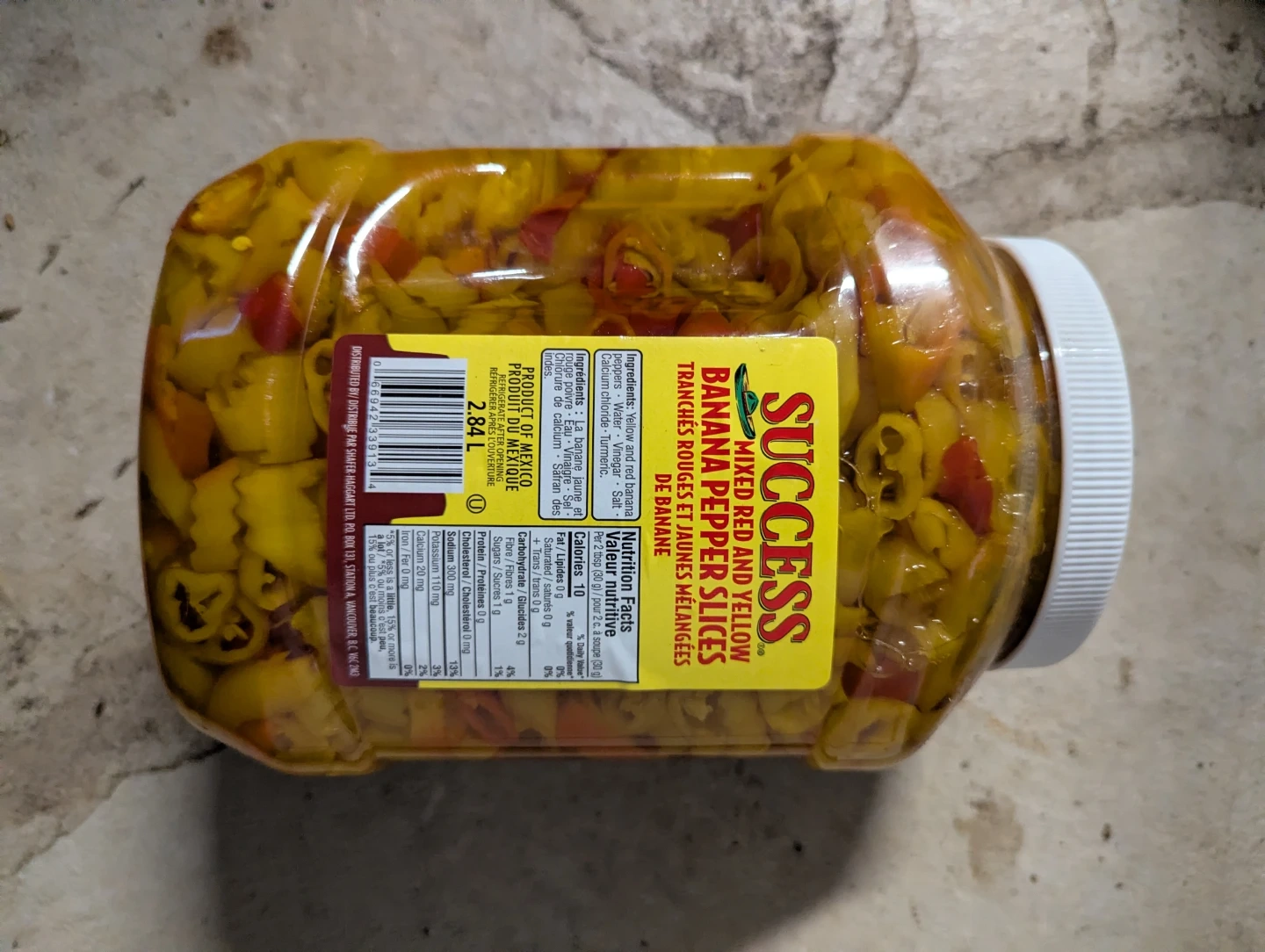 I have Success brand mixed red and yellow banana pepper slices and pickled green sliced jalapeno peppers.