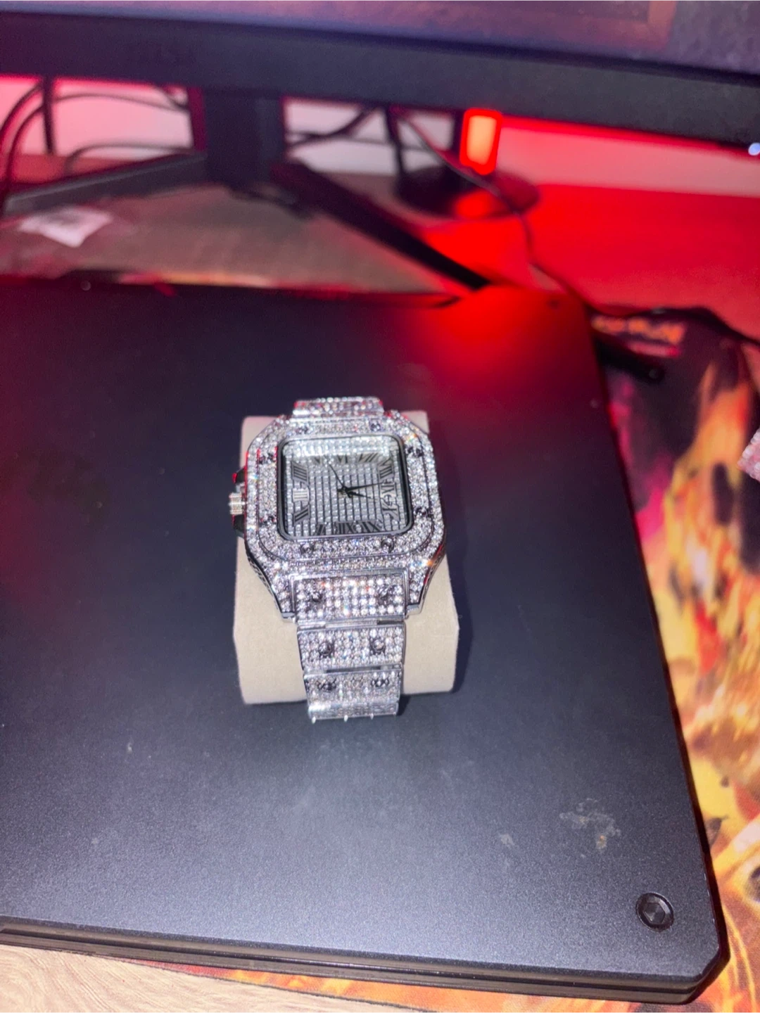 Selling a silver watch with diamond-like studs. It's a real eye-catcher! The watch has a square face and a matching bracelet. It's in great condition and ready to wear.