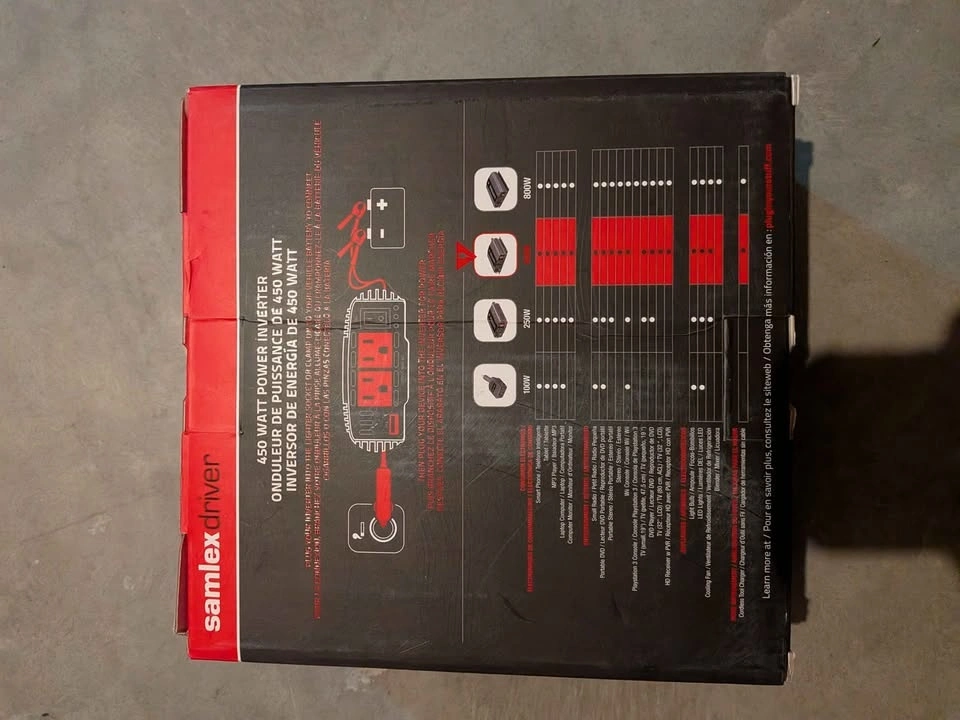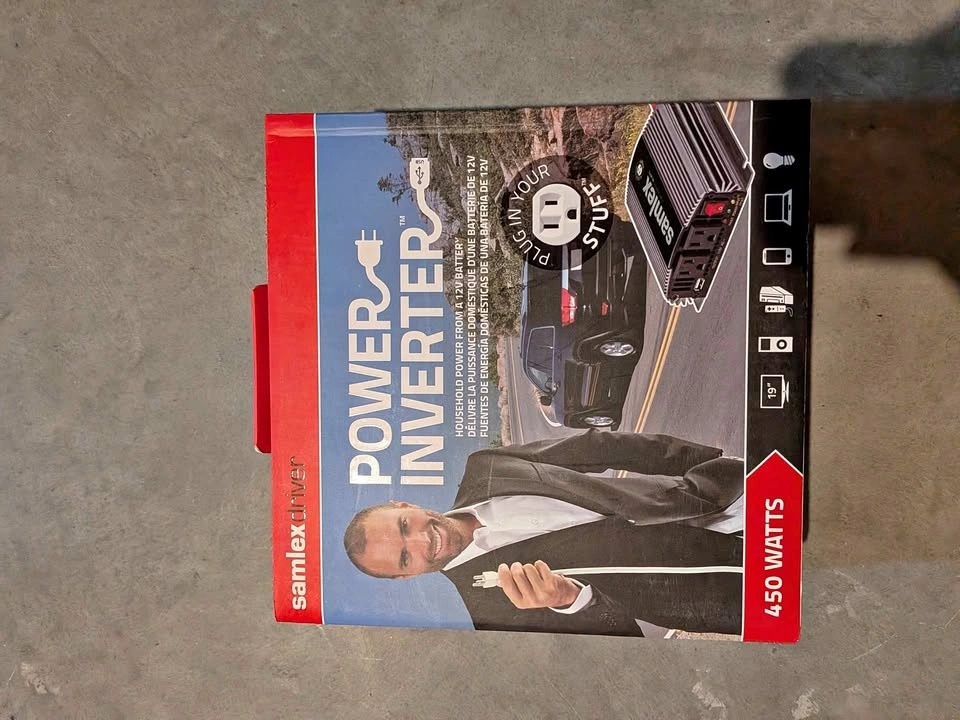 Selling a Samlex 450-watt power inverter in excellent condition. Converts 12V DC to 120V AC, perfect for cars, trucks, RVs, camping, or emergency backup power. Reliable brand with built-in safety protection. Easy to use and very portable.