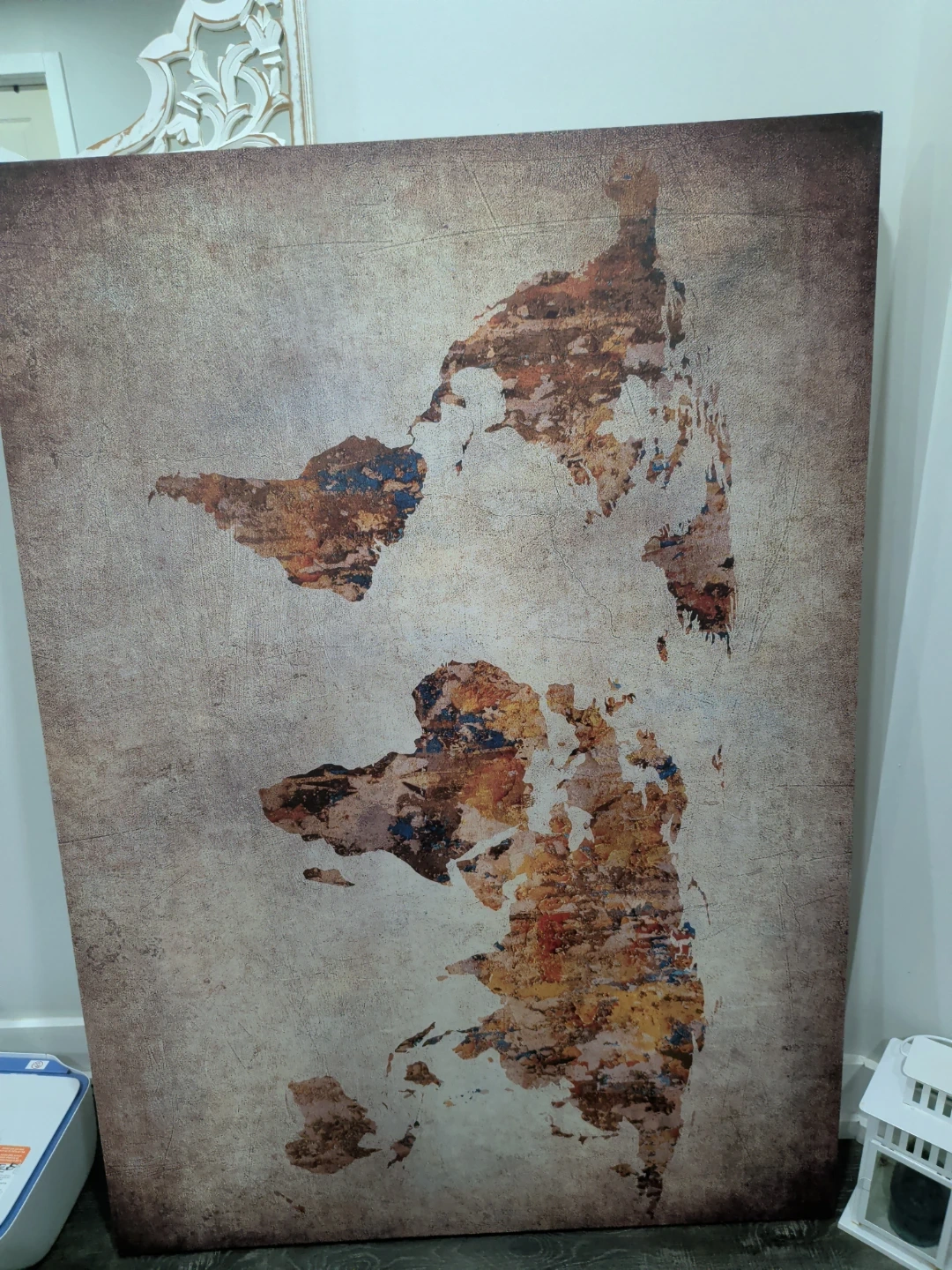 Selling a unique canvas art piece featuring a world map design! It's in great condition and would add a cool, artistic touch to any room. It's large and I can provide exact measurements upon request.