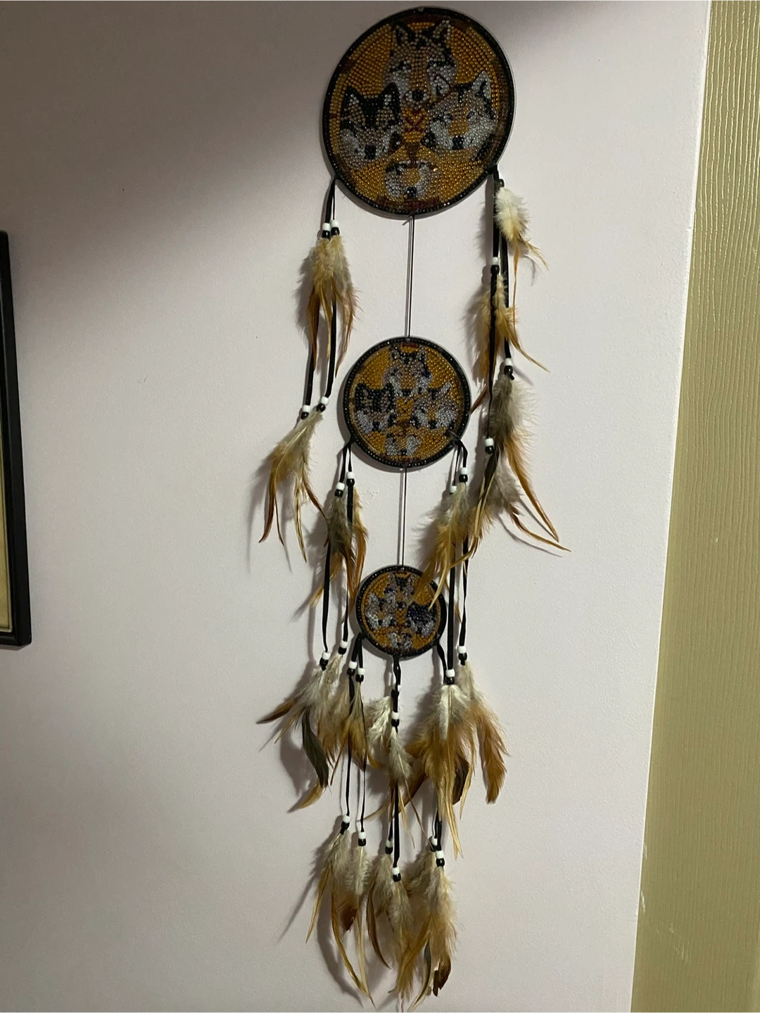 This is a handmade dream catcher featuring a wolf design. It's perfect for adding a unique touch to your home decor