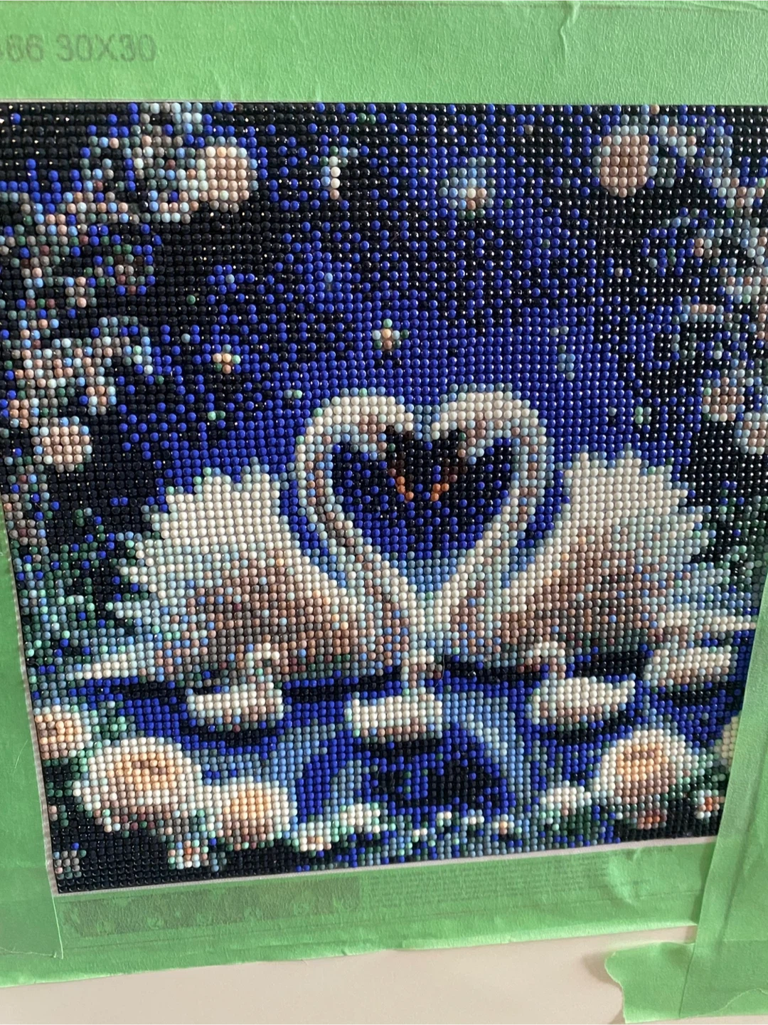 Here's a diamond art painting featuring a pair of swans forming a heart shape. The background is a mix of blue and black, with some lighter accents.