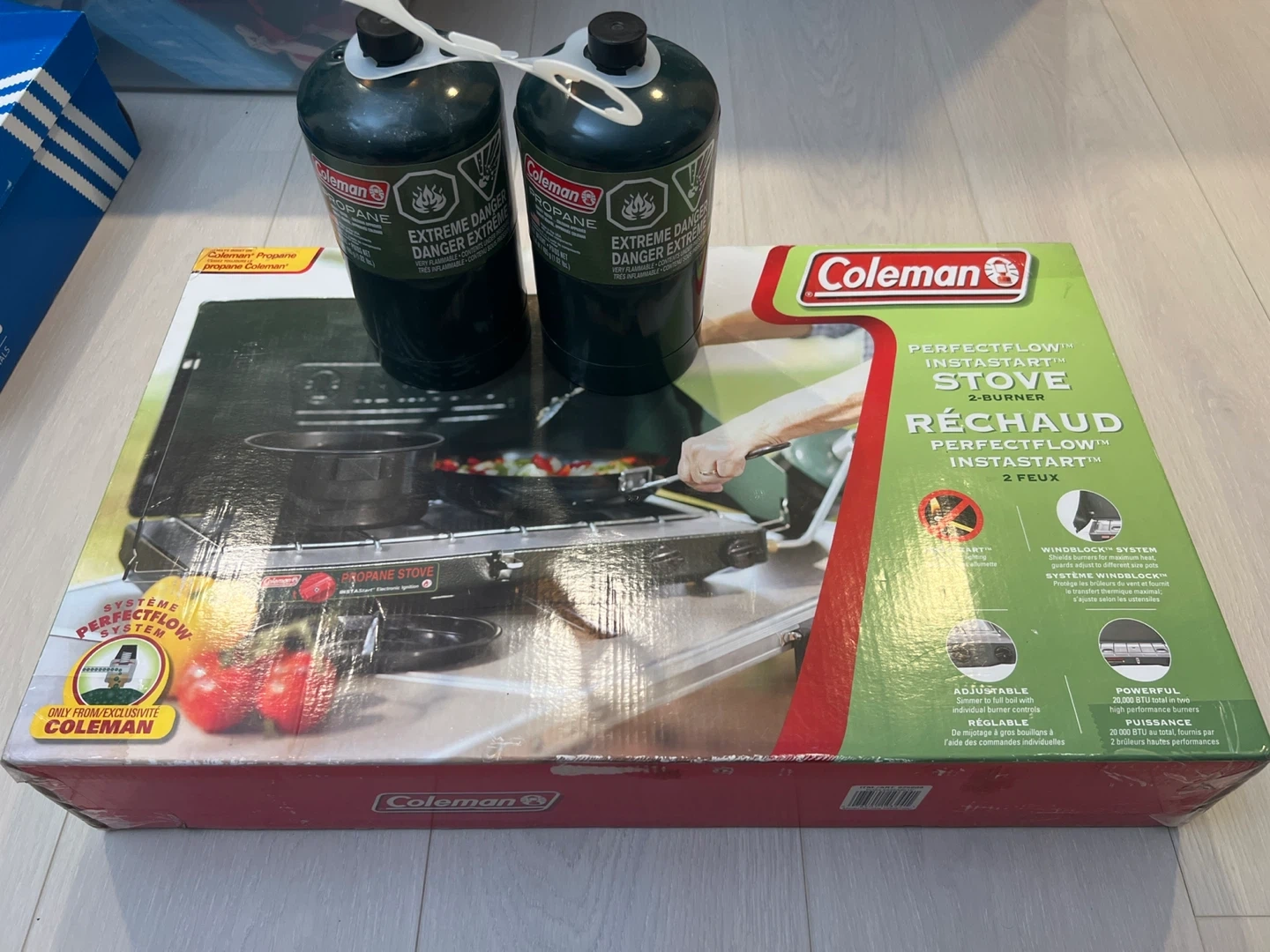 It also comes with two Coleman propane canisters