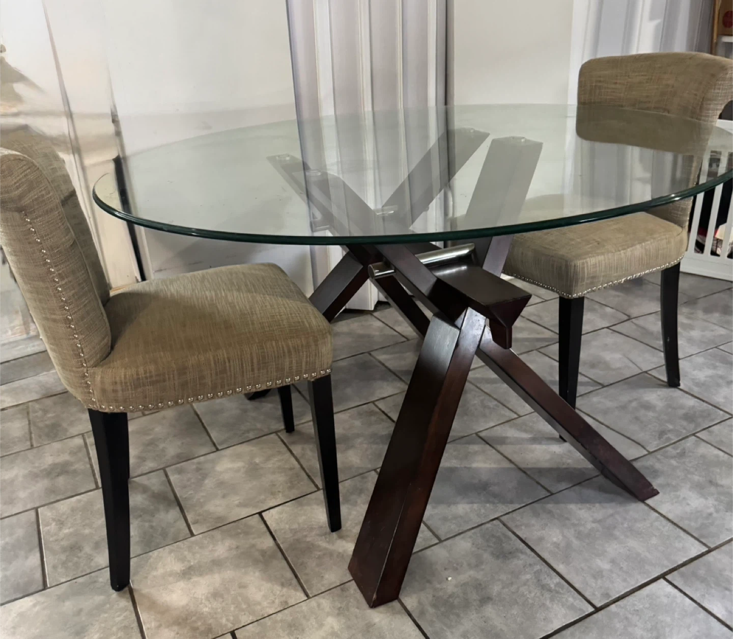 Selling a glass top dining table with two matching chairs. The table features a unique, modern base design. The chairs are upholstered in a neutral fabric with decorative nailhead trim. Great for a small dining area or kitchen nook!