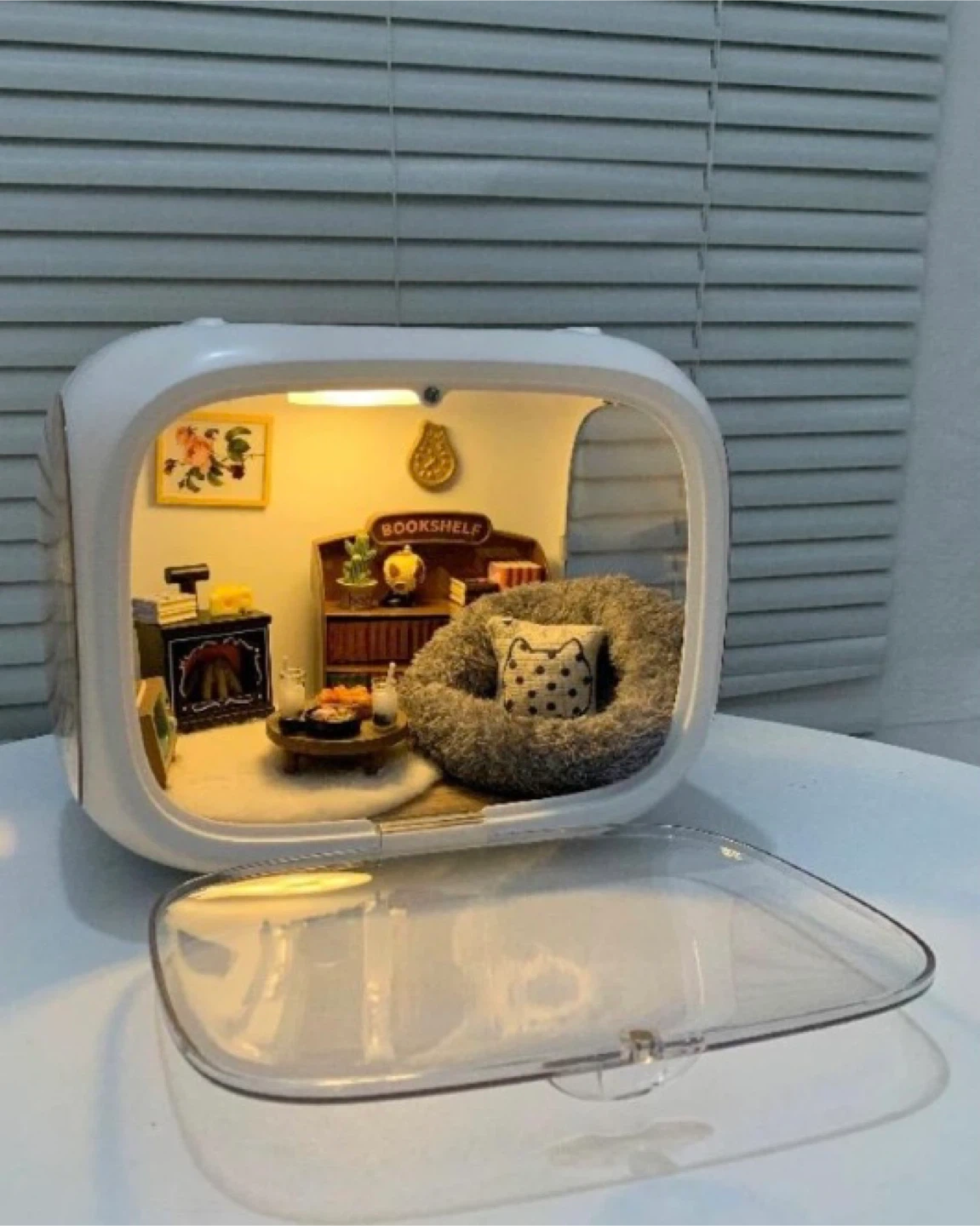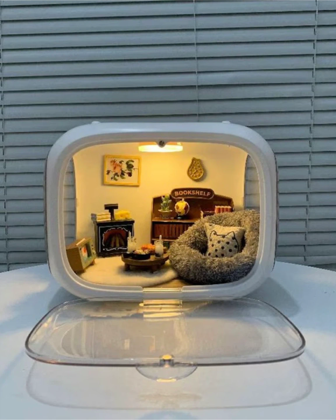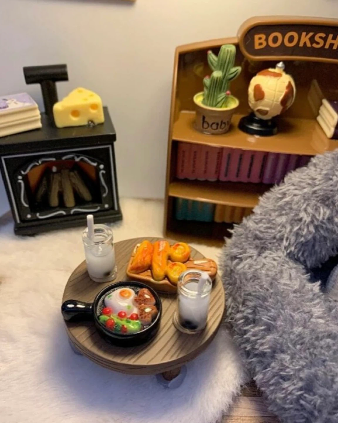 This is a super cute DIY miniature dollhouse kit! It features a cozy bookshelf theme with lots of tiny details like a fireplace, books, and even a little meal setup. It's perfect for anyone who loves miniatures or enjoys crafting. The kit comes in a white, retro-style TV shaped case with a clear cover