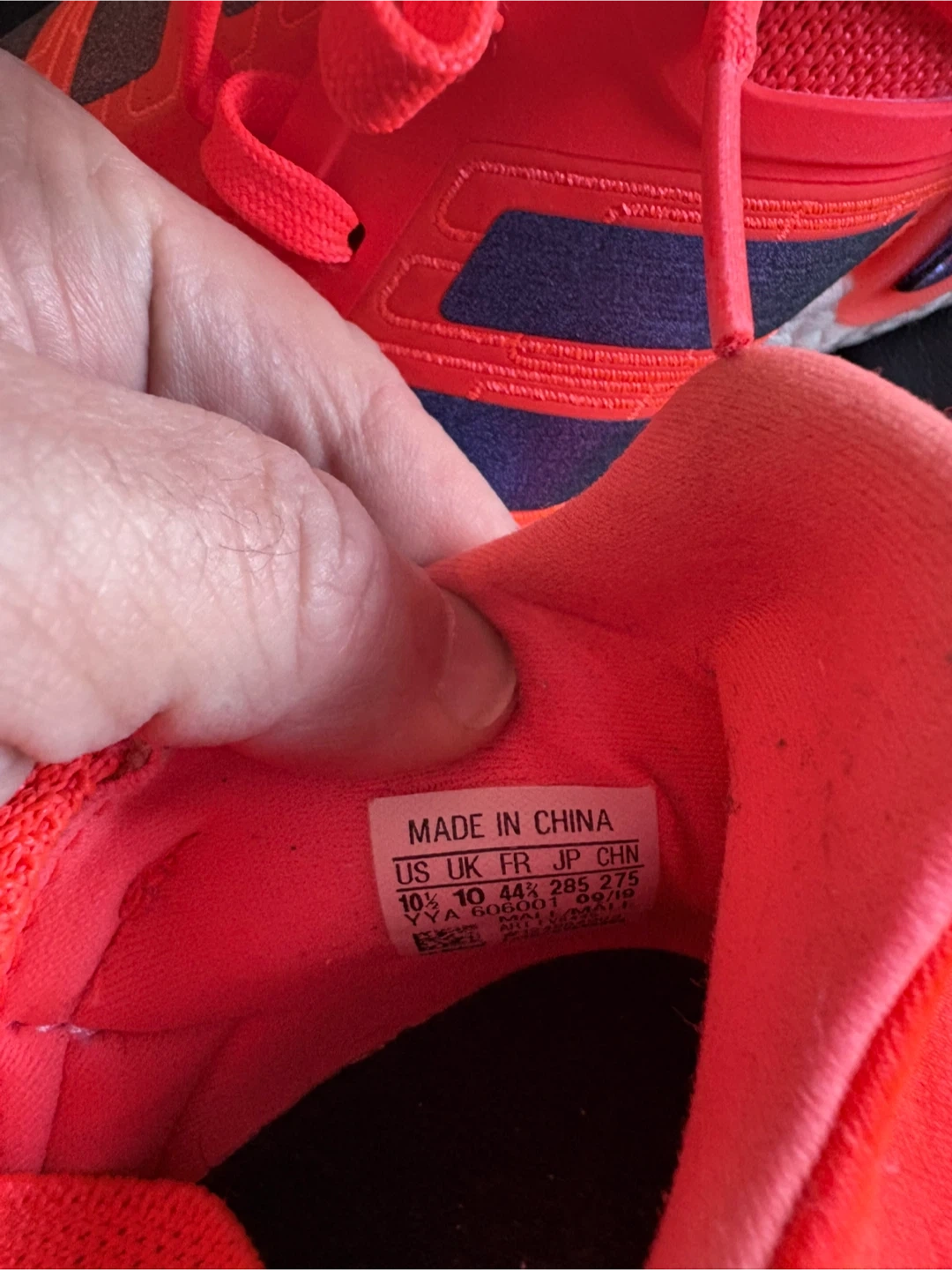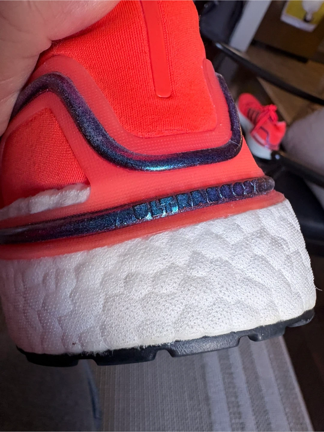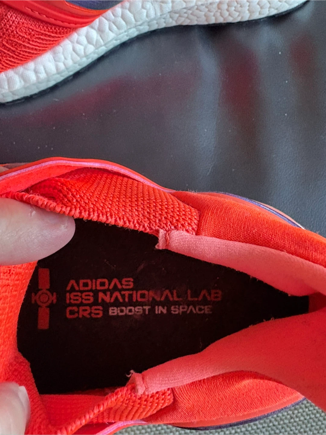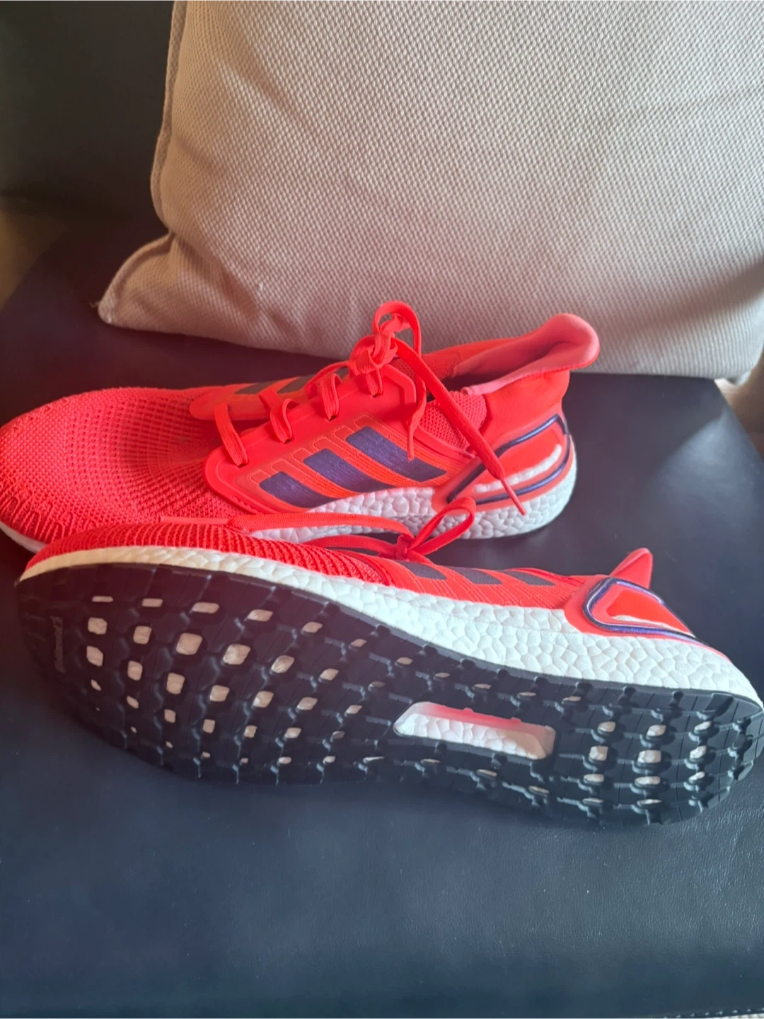 Selling a pair of Adidas Ultraboost 20 ISS National Lab running shoes in US size 10.5. These are in a vibrant orange colour. They feature the Boost midsole for comfortable cushioning. Great for running or casual wear!