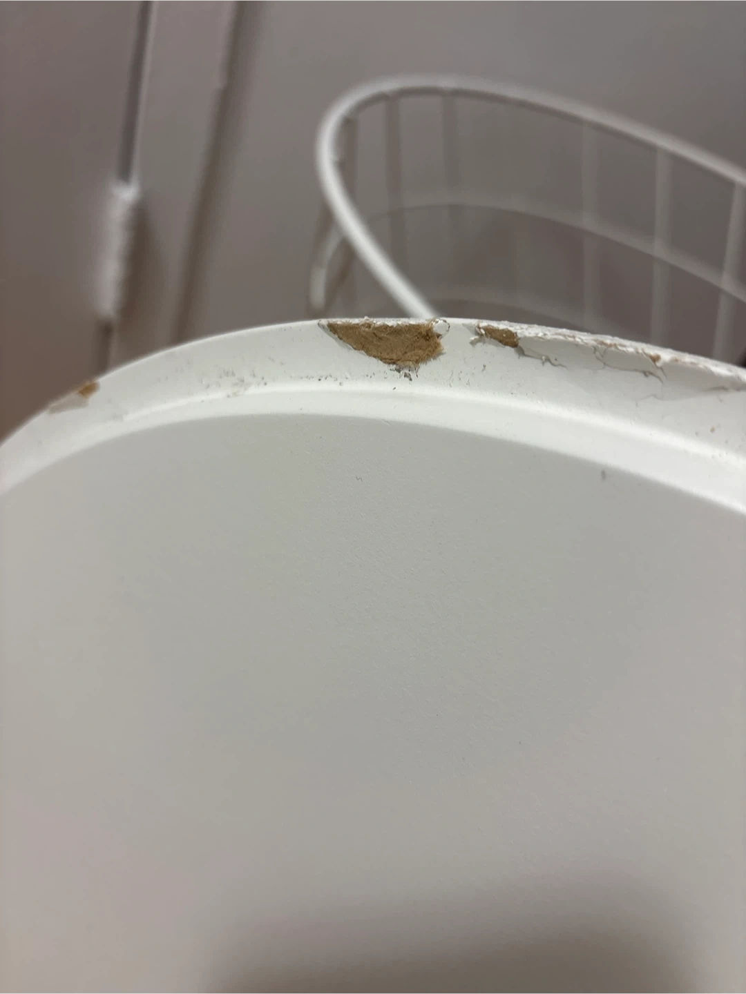 Selling a white wire side table. It has a circular top and a unique wire base design. There are some signs of wear on the top edge, as shown in the photos, but it's still a sturdy and stylish piece for any room hence the low price.