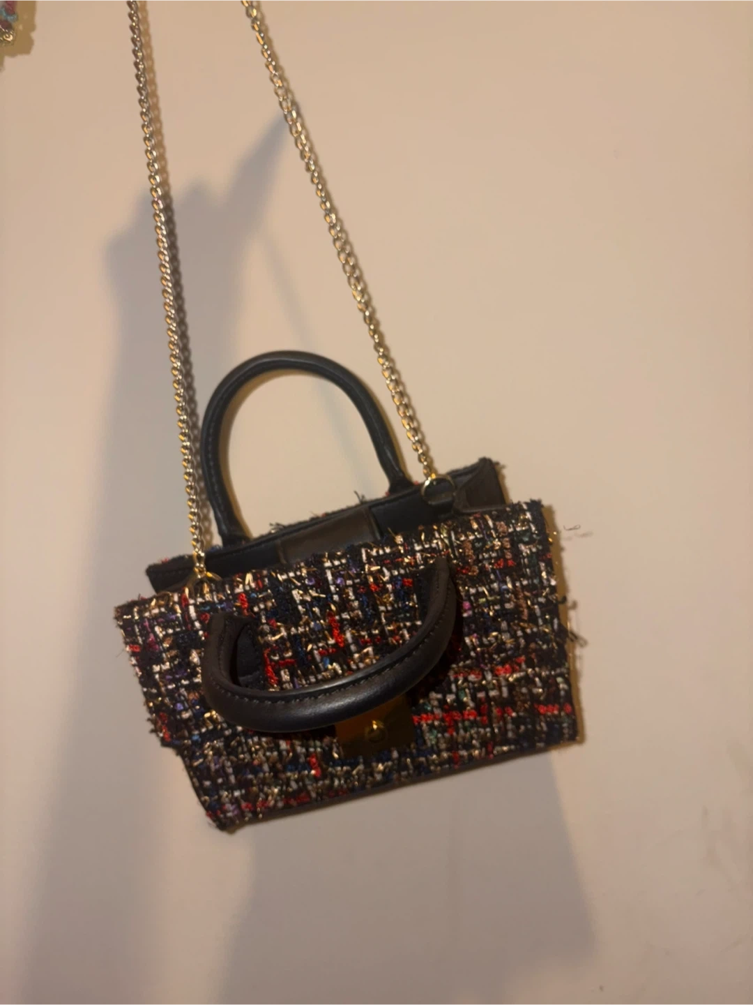 Check out this cute Guess mini top handle bag! It features a tweed design with black leather handles and a gold chain strap. It's perfect for adding a touch of style to any outfit