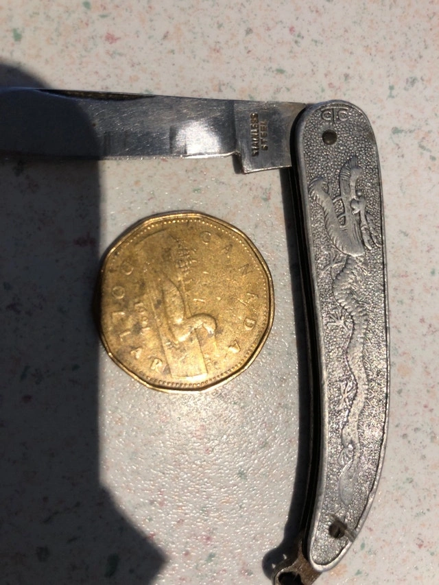 For sale are two used pocket knives. The first is a small pocket knife with a stainless steel blade and a dragon design on the handle. The second is a larger, multi-blade pocket knife with a wood handle.