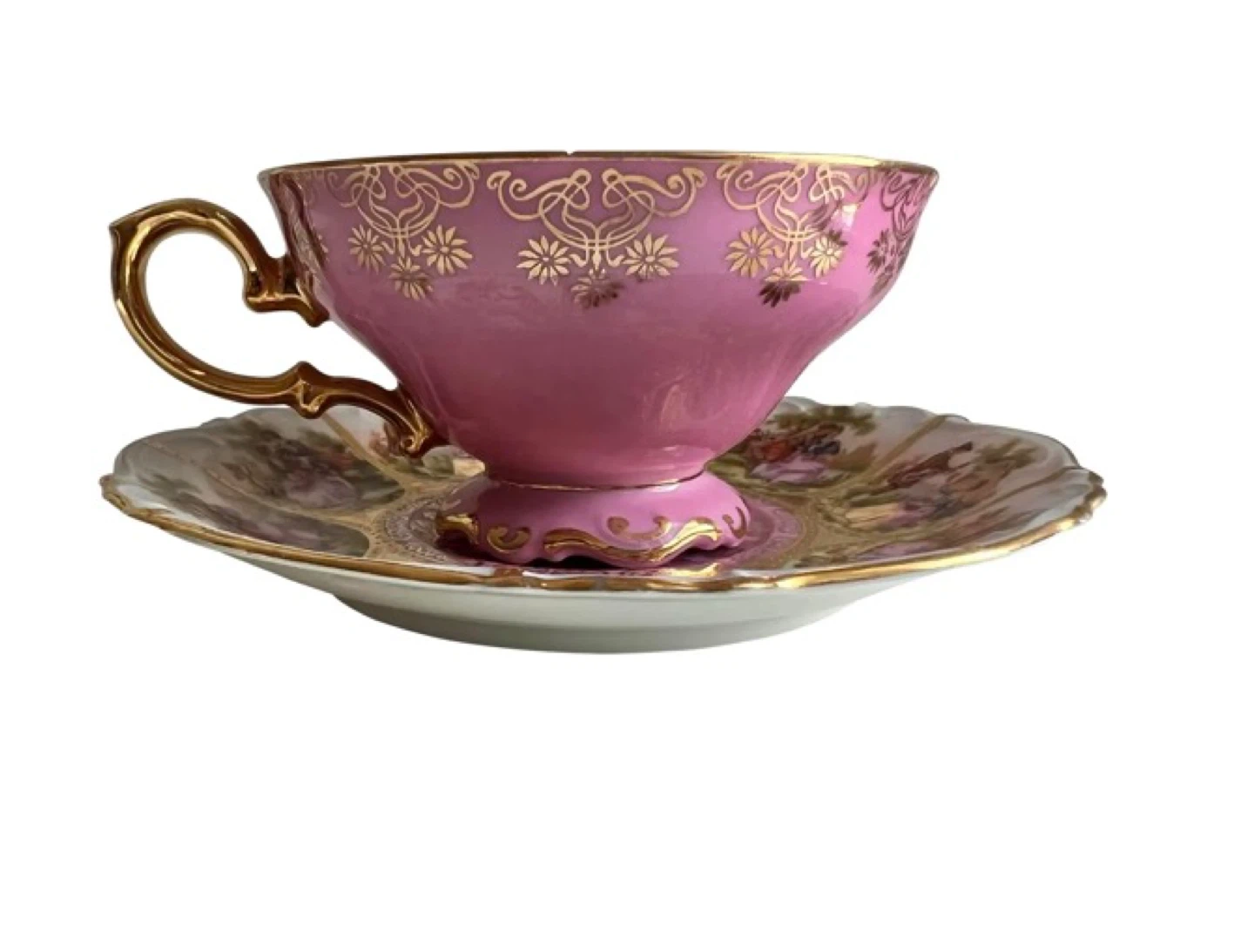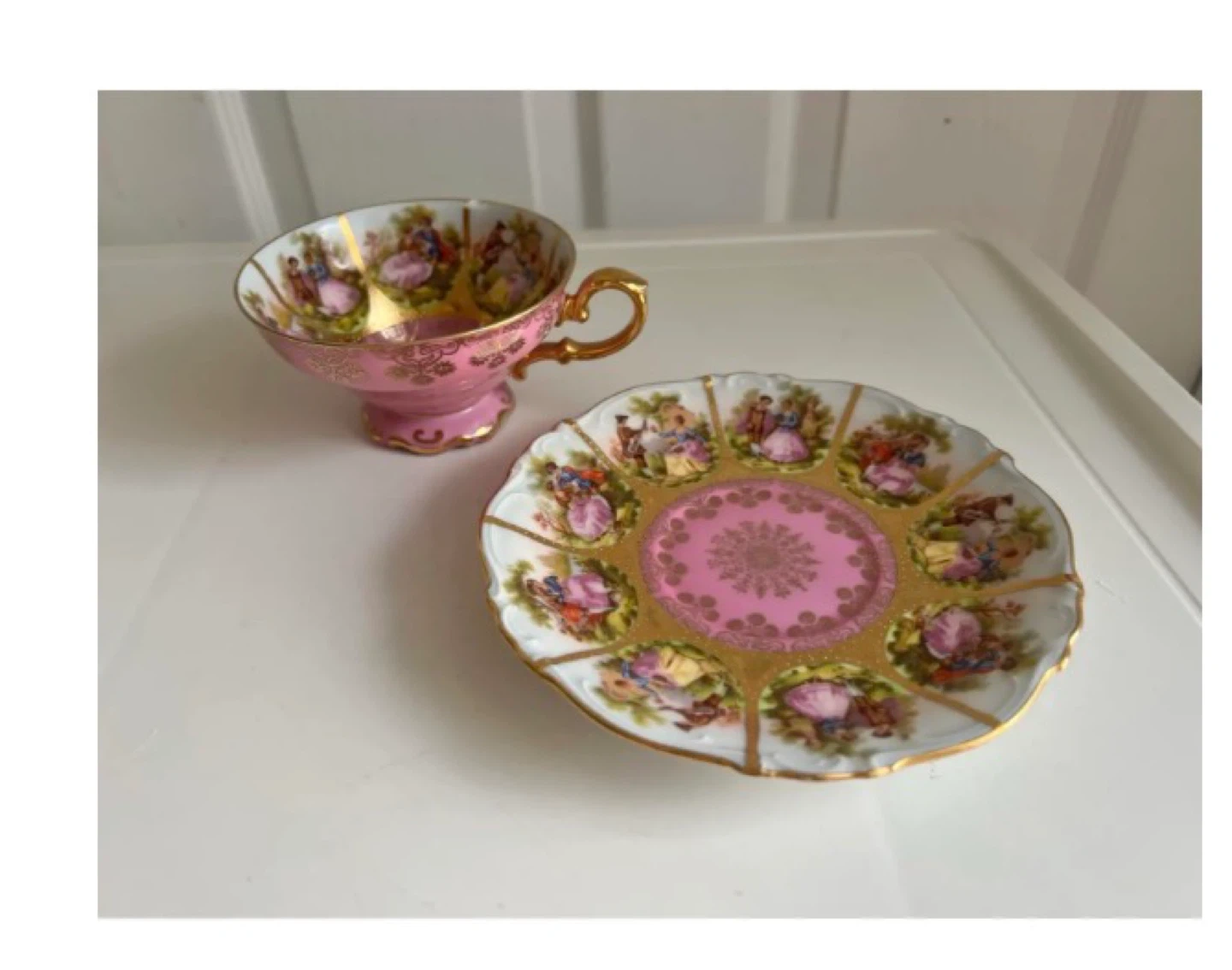 Selling a beautiful pink tea cup and saucer set from JK Design Poland. The set features gold detailing and a delicate design. Perfect for tea time or as a decorative piece! 2 sets & milk pitcher as well