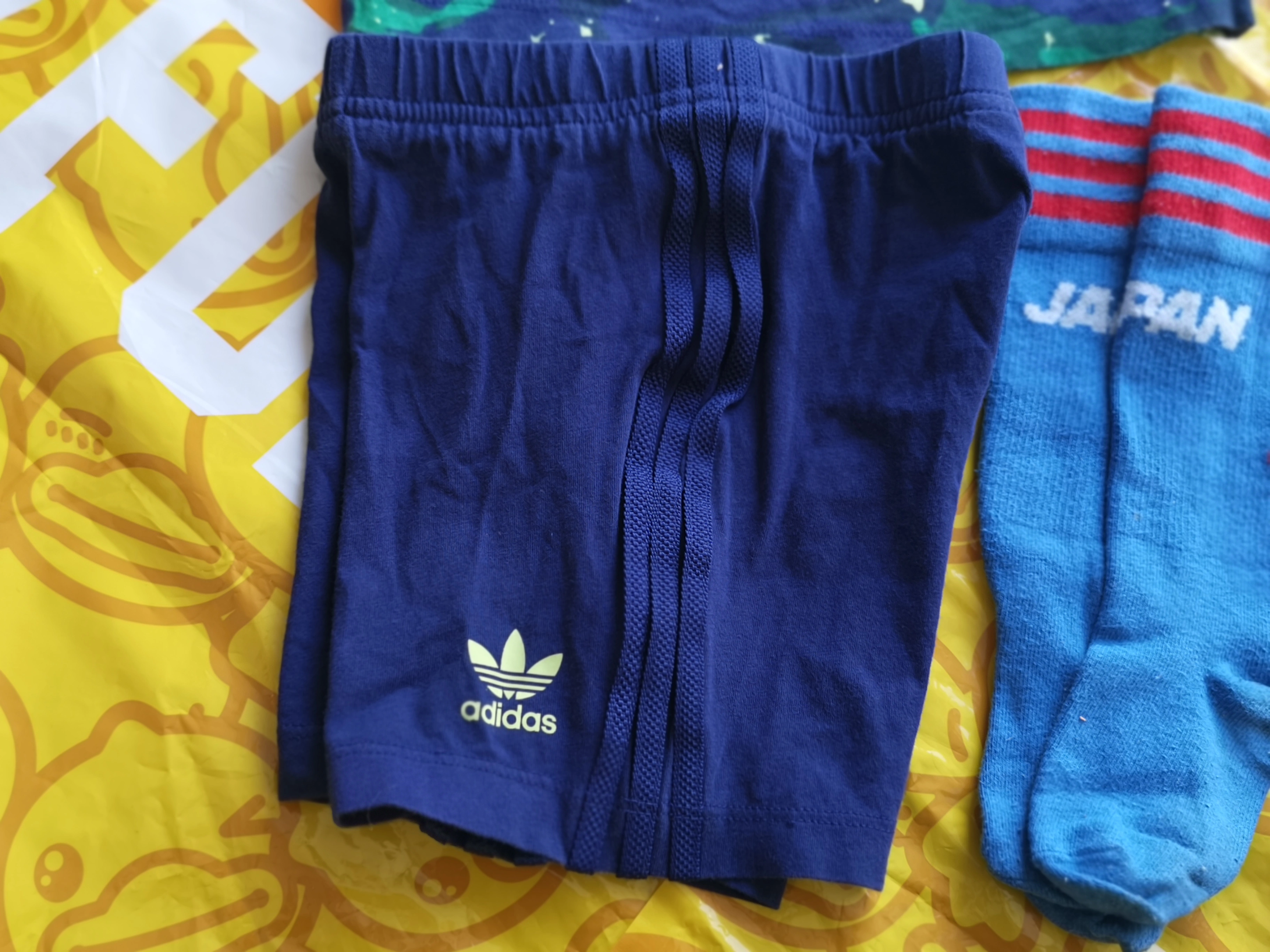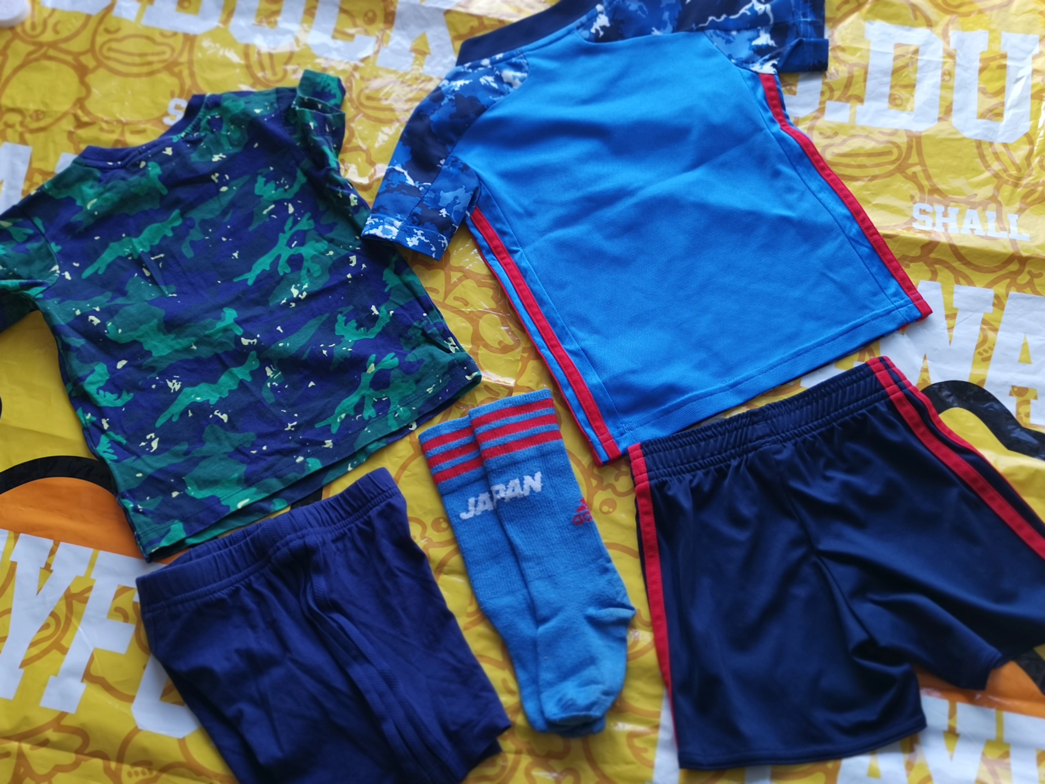 Selling an Adidas Japan soccer jersey set. It includes a blue camo jersey, navy shorts, a green camo shirt and socks. Great for any young soccer fan!