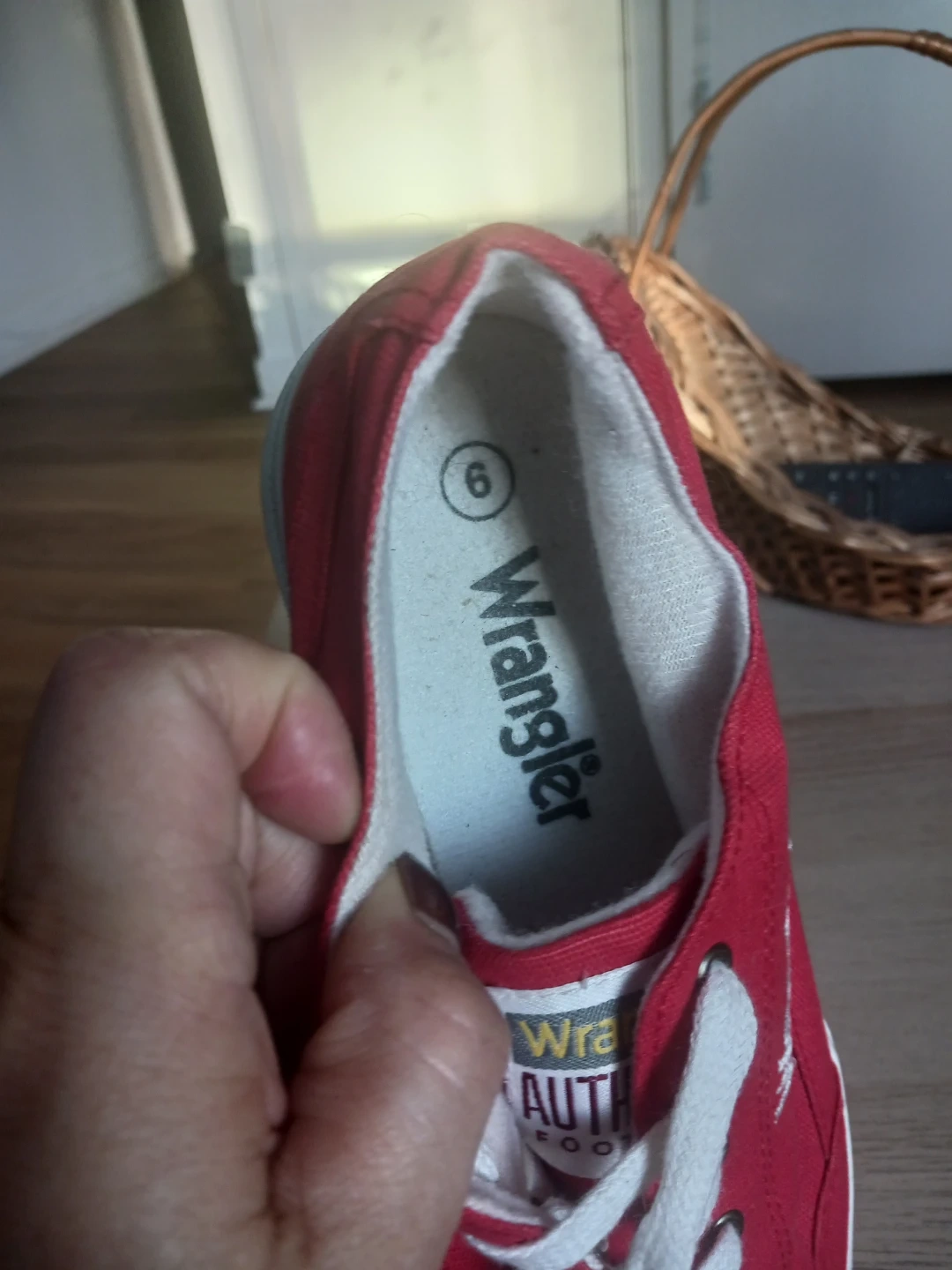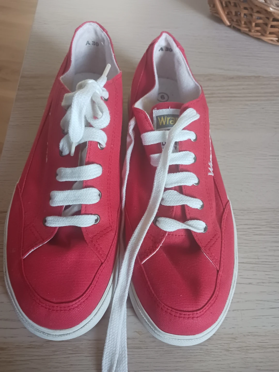 Selling a pair of red Wrangler canvas sneakers. They are a size 6 and in great condition. Perfect for casual wear! Men's size 6 not women's never been worn