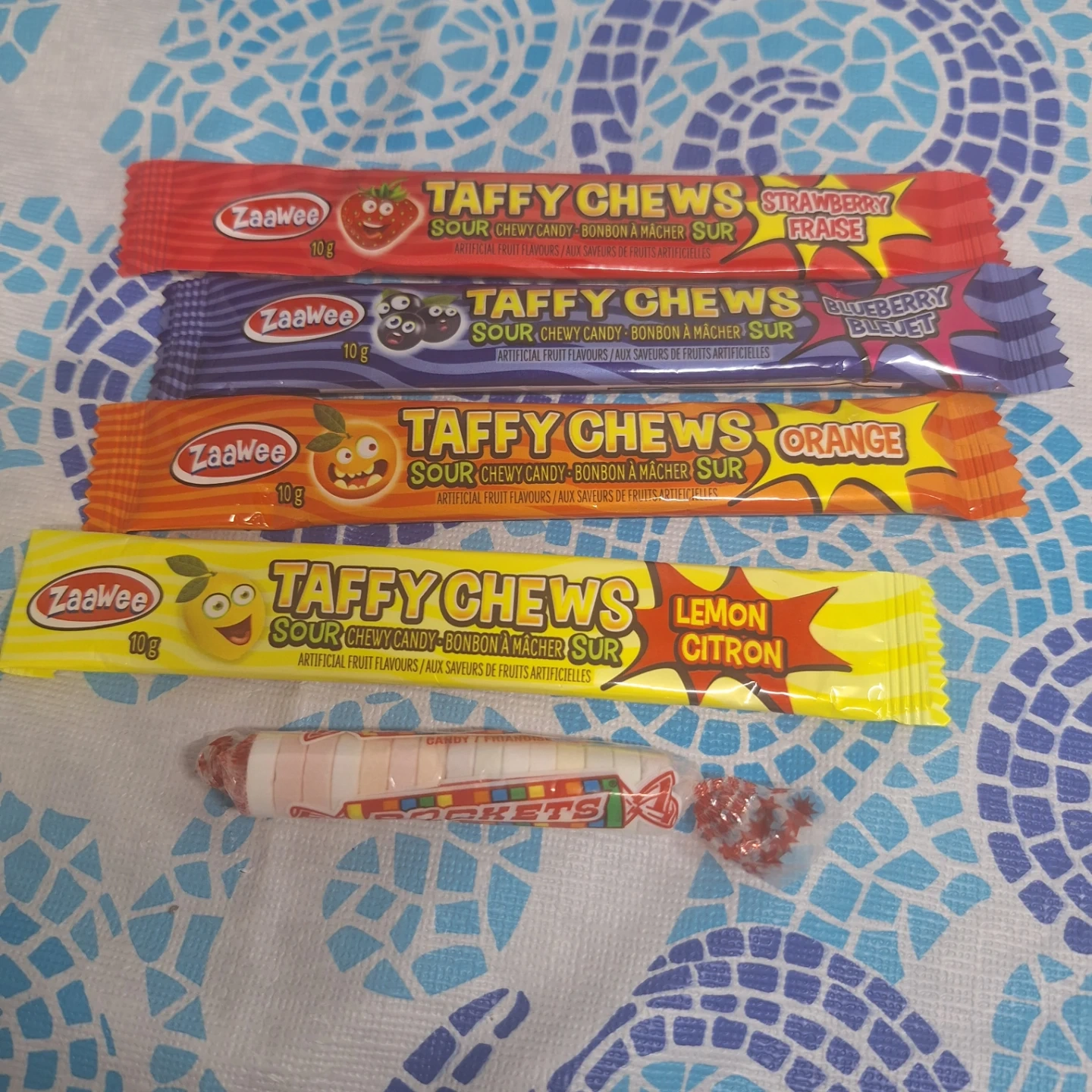I'm offering a selection of Zaawae Taffy Chews, perfect for a sweet and sour treat! These chewy candies come in a variety of fruit flavors to tantalize your taste buds.