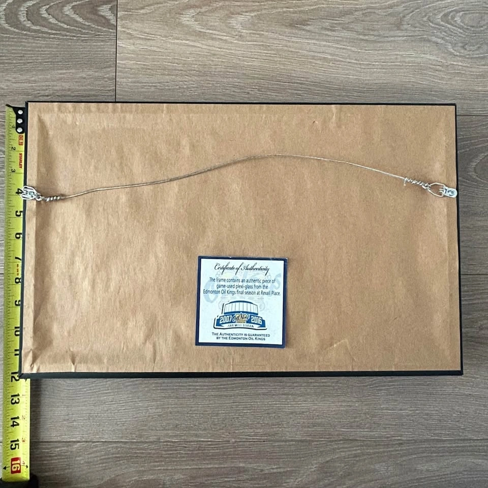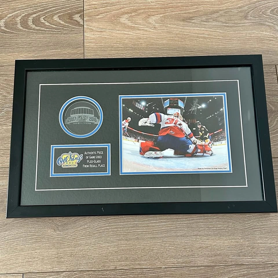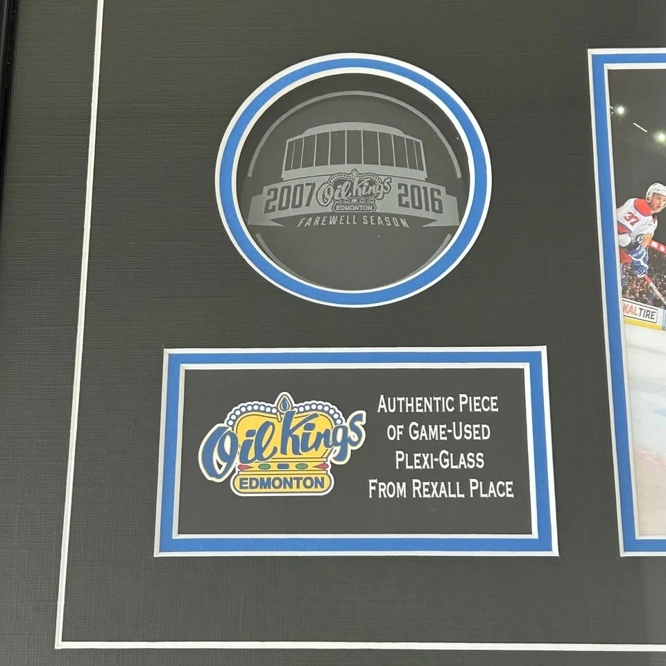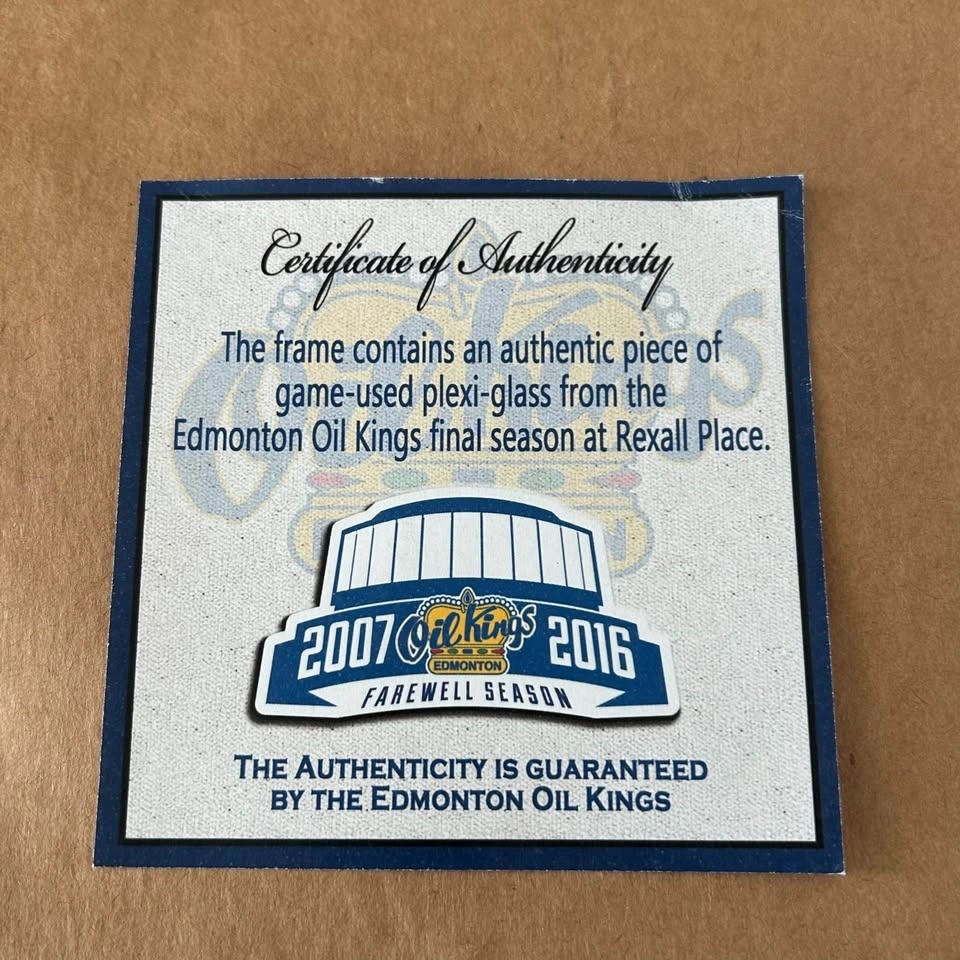 Collectible Edmonton Oil Kings display featuring an authentic piece of game-used plexi-glass from Rexall Place during the historic 2007–2016 Farewell Season.