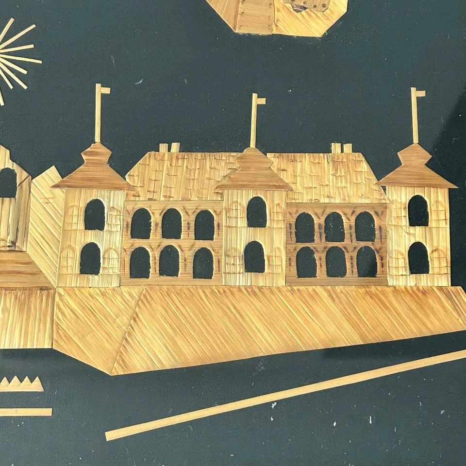 Beautiful vintage straw-marquetry artwork featuring the iconic Jasna Góra Monastery with the image of the Black Madonna. A classic piece of traditional craftsmanship, made using natural straw in warm golden tones on a deep black background.