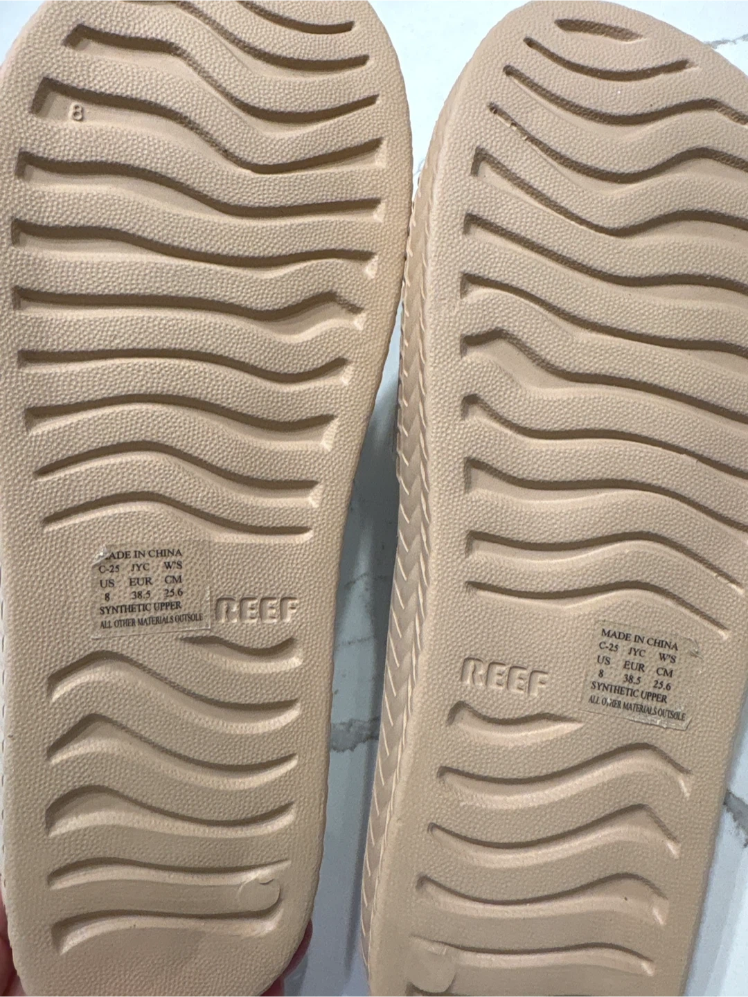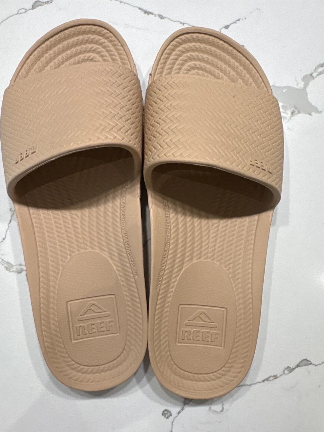 Selling a pair of Reef women's slides in a neutral beige colour. They are a size 8. Perfect for wearing around the house or out and about!