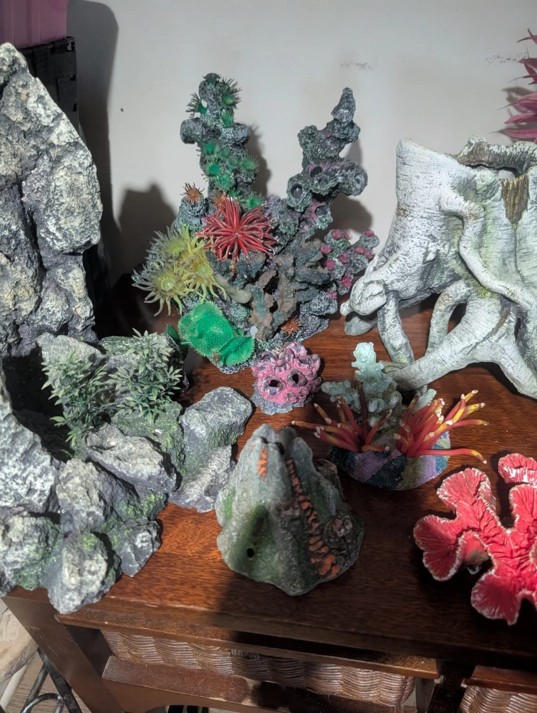 Selling a variety of aquarium decorations and accessories! Includes rocks, coral, plants, a net, and other miscellaneous items. Everything you need to create a beautiful underwater world for your fishy friends. Huge tote full of stuff heaters lights etc