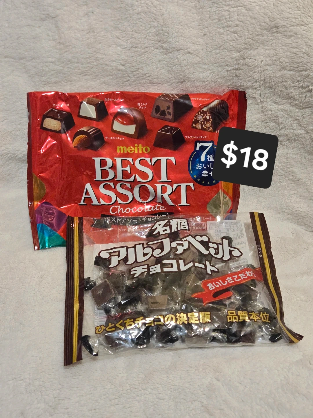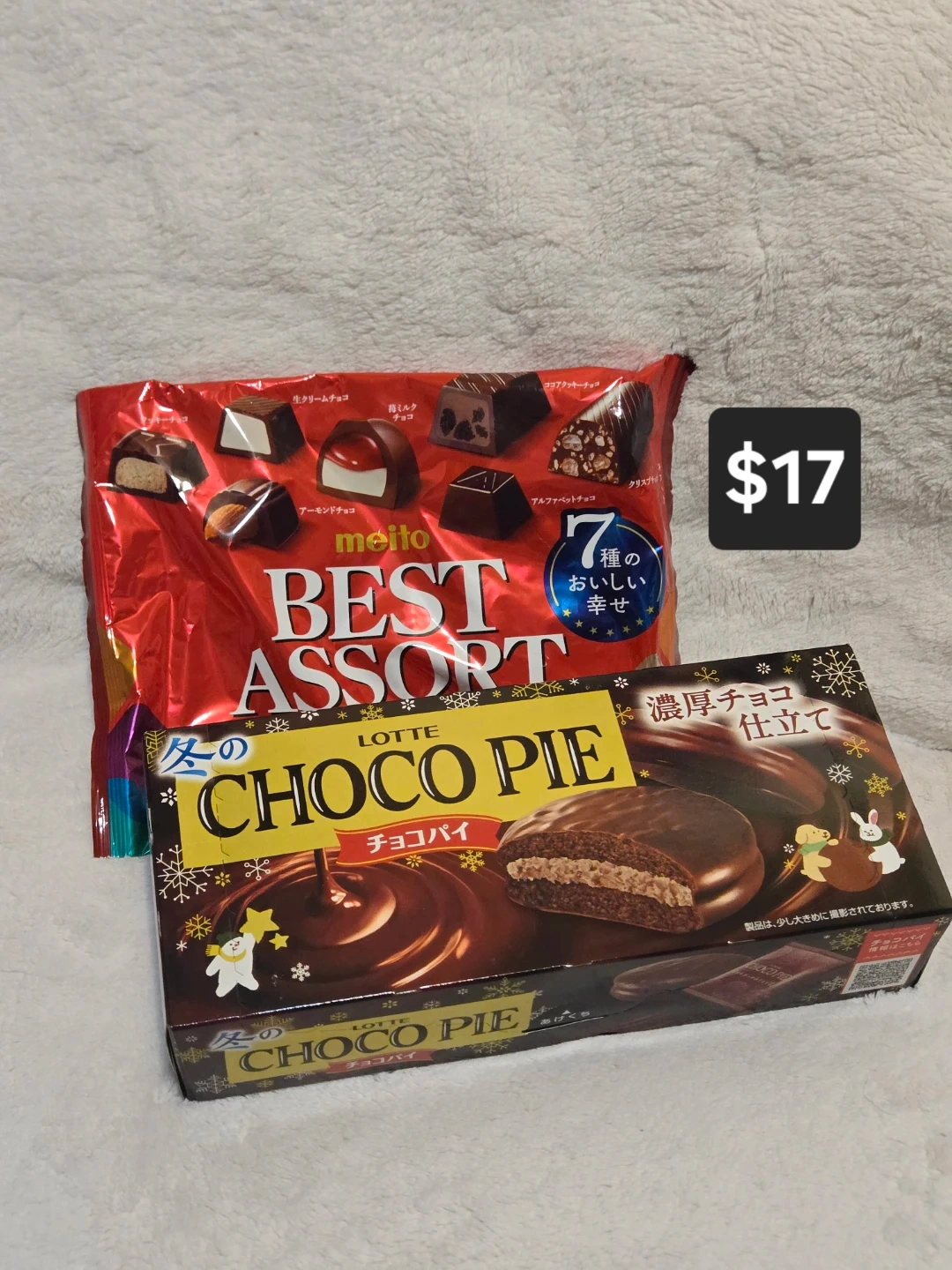 Selling a variety pack of Japanese chocolates! Includes Meiji Almond, Meiji Macadamia, Lotte Choco Pie, and Meito Best Assort. Perfect for trying a range of delicious treats
